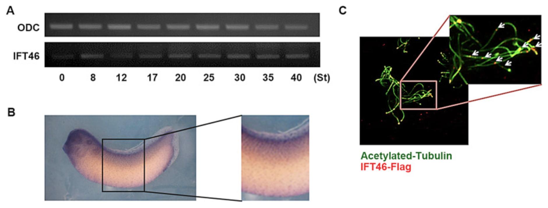 Spatio-temporal expression patterns of IFT46 during embryogenesis. (A) Xenopus embryos were harvested at various stages and RT-PCR was performed using standard methods. The numbers indicate embryonic stages and ornithine decarboxylase (ODC) was a loading control. IFT46 is expressed as a maternal gene. (B) Xenopus embryos were harvested at stage 32 and processed via whole mount in situ hybridization using Dig-labeled antisense probes of IFT46. IFT46 was expressed in the central nervous system and multiciliated cells. The right figure is higher magnification view. (C) Both blastomeres of 2-cell stage embryos were injected with IFT46 mRNA containing a Flag tag and harvested at stage 27. Embryos were immunostained with acetylated tubulin-monoclonal antibody (green) and Flag-polyclonal antibodies (red). IFT46 was localized along the axoneme of motile cilia of epithelial cells. White arrows indicate IFT46 proteins. Right figure is higher magnification view (For interpretation of the references to colour in this figure legend, the reader is referred to the web version of this article).
