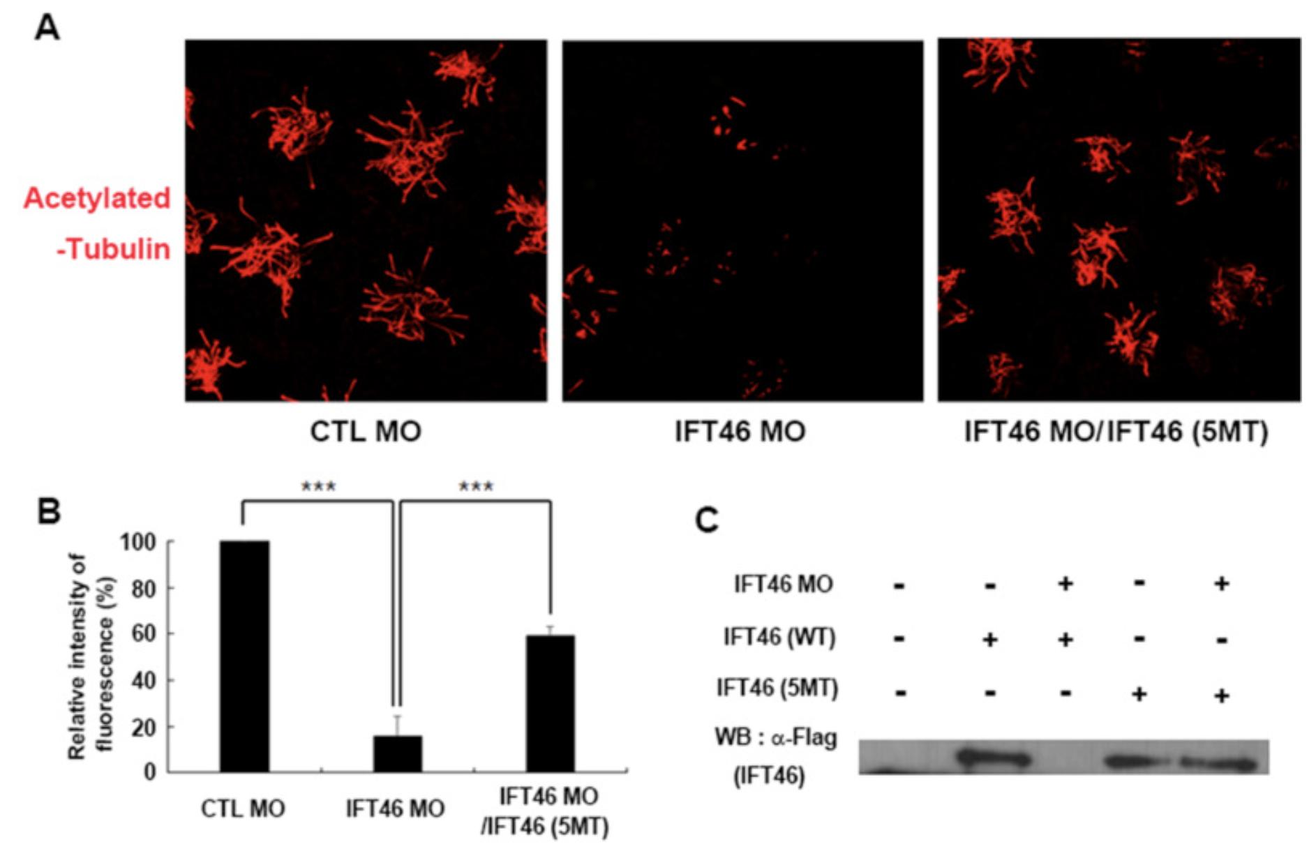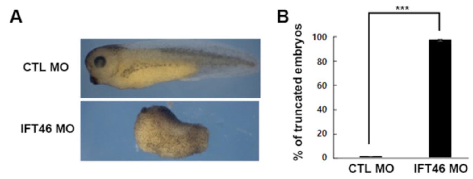 Loss of IFT46 causes ventralized phenotype (A) Embryos were injected with 10 ng of IFT46 MO into the both blastomeres of 2-cell staged embryos. IFT46 morphants showed defects in head and eye formation and convergent extension. (B) Relative quantification of the number of control and IFT46 morphants. Most embryos injected with IFT46 MO showed similar phenotypes. Data are shown as mean ± SD, and the number of embryos per sample is 25. ***p < 0.001 compared with control MO-injected.