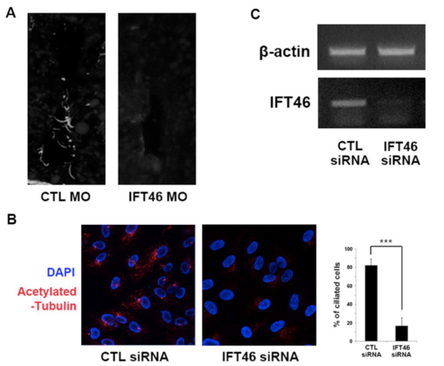 Loss of IFT46 hinders primary cilia formation. (A) Both blastomeres of 2-cell staged embryos were injected with IFT46 MO and fixed embryos at stage 32. Primary cilia in the neural tube lumen were detected by immunofluorescence staining using acetylated tubulin-antibody (gray) and confocal microscopy. (B) Treatment of IFT46 siRNA for 24 h and serum starvation was performed to induce primary cilia for 48 h. We performed immunofluorescence staining of the nucleus and primary cilia using DAPI (blue) and acetylated tubulin-monoclonal antibody (red) respectively. Compared with the control, IFT46 siRNA-treated cells show short or no primary cilia. Data are shown as mean ± SD. ***p < 0.001 compared with control siRNA-treated. (C) RT-PCR was performed to evaluate the knockdown of IFT46. β-actin was used as a loading control (For interpretation of the references to colour in this figure legend, the reader is referred to the web version of this article).