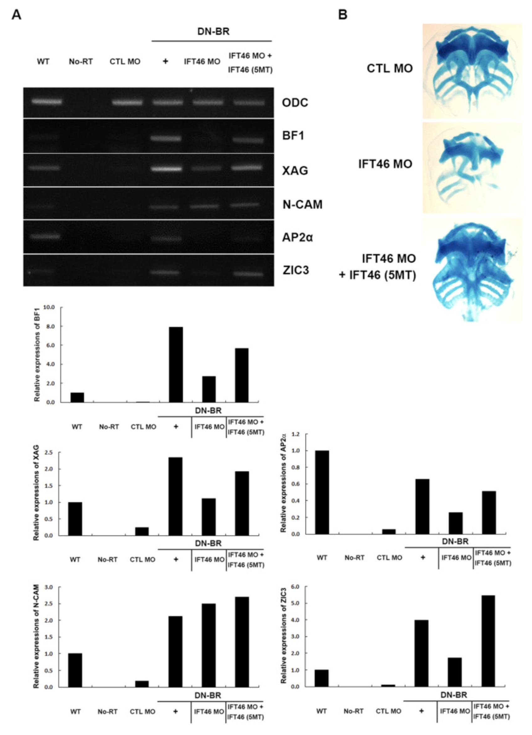 Loss of IFT46 induces severe reduction in neural development and cartilage formation. (A) 10 ng of IFT46 MO was injected into the both blastomeres of 2-cell staged embryos with 2 ng of dominant-negative BMP-4 receptor (DN-BR) mRNA. Animal caps were dissected from injected embryos at stage 8.5 and collected at stage 18. The animal cap was processed for RT-PCR using standard methods. ODC was used as a loading control. No-RT indicates the control in the absence of reverse transcriptase. Quantification of the relative expression levels of BF-1, XAG, N-CAM, AP2α, and ZIC3 normalized to ODC expression. (B) Both blastomeres of 2-cell staged embryos were injected with 5 ng of IFT46 MO. Tadpoles were fixed at stage 50 and subjected to Alcian blue staining for cartilage formation. IFT46 morphants showed severe defects on cartilage formation (For interpretation of the references to colour in this figure legend, the reader is referred to the web version of this article).
