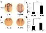 Loss of IFT46 affects neural development (A) MO-injected embryos at stage 17 of neural plate were visualized by whole mount in situ hybridization for SOX3. The neural plate was wider in IFT46 MO-injected embryos. (B) We measured the length of half of the neural plate for SOX3. Data are shown as mean ± SD, and the number of embryos per sample is 25. ***p < 0.001 compared with control MO-injected. (C) Using the neural crest cell marker PAX3, neural tube closure was abnormal in IFT46 MO-injected compared with control MO-injected embryos. (D) We calculated the length of the gap between the neural fold for PAX3. Data are shown as mean ± SD, and the number of embryos per sample is 25. ***p < 0.001 compared with control MO-injected.2