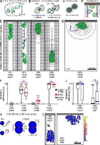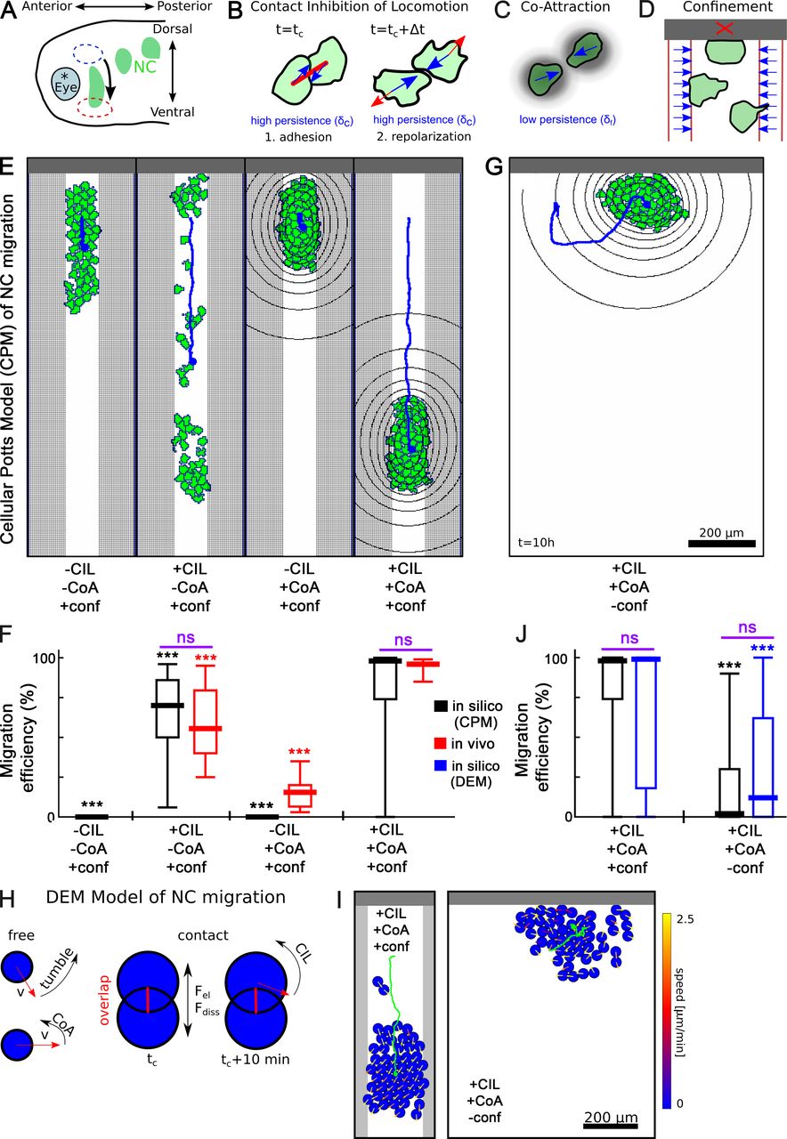 Figure 3. Computational model of NC migration. (A) Schematic embryo during NCC migration in the Xenopus head. (BâD) Cell interactions in the CPM: CIL (B), CoA (C), and dorsal and lateral confinements (D). (E) CPM configurations for versions of NC migration in constrained geometries with and without CIL and CoA. (F and J) Migration efficiencies. Error bars: min-max values, boxes: quartiles; central value: median; n = 50 simulations. Significance compared with relevant control, where significance bars (purple) compare data from the same conditions. (G) CPM configuration in unconstrained geometry. (H) Rules of the DEM model of NCC migration. (I) Configuration of the DEM model with and without confinement. ***, P < 0.001; ns, not significant. |