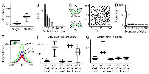 Figure S3. Computational model of NC cluster migration, related to Fig. 3. (AâE) Analysis of the NC migration model with CIL and CoA in unconstrained simulations. (A) NCC persistence in isolation and in cluster matching experimentally measured values 0.1 and 0.5 (Theveneau et al., 2010). (B) Duration of cellâcell contact in simulations of two-cell collisions. (C) Relative angle of velocities before and after two-cell collisions are largely uncorrelated, similar to previously reported experimental observations (Woods et al., 2014). (D) Cluster dispersion without confinement depends on cluster size. (E) Size dependence of dispersion is explained by lower levels of chemoattractant surrounding smaller clusters. Graph shows chemoattractant level profile along the cross section of 50 simulated clusters from simulations with n = 16, 50, and 100 cells each. (F) Net cluster displacements within 3 h. (G) Cluster dispersion over 10 h. Boxplots show median, quartiles as boxes, and minâmax values as error bars. |