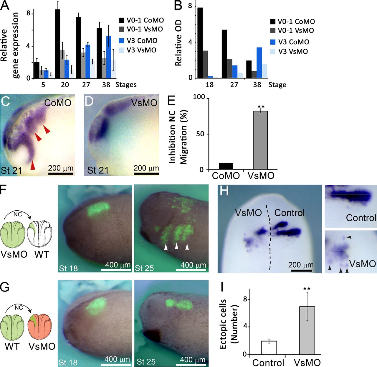 Figure 2. Versican is required for normal NC migration. (A and B) qPCR (A) and Western blot (B) analysis of CoMO- and VsMO-injected embryos. (CâE) ISH of Twist in embryos injected with either CoMO (C) or VsMO (D), and inhibition of migration (E; C: n = 91, D: n = 135). (F and G) Graft experiments: VsMO + fluorescein-dextran (FDx)âinjected NCC grafted into control host (F; 76% of migration, n = 17) or CoMO + FDx NCC grafted into VsMO-injected host (G; 13% of migration, n = 15). (H and I) ISH against Krox20, showing an uninjected versus VsMO-injected side of a stage 24 embryo (H, dorsal view; n = 53), and number of ectopic NCC (I; n = 51). Bars, mean; error, SEM. Arrowhead represents a migrating NC. **, P < 0.01. |