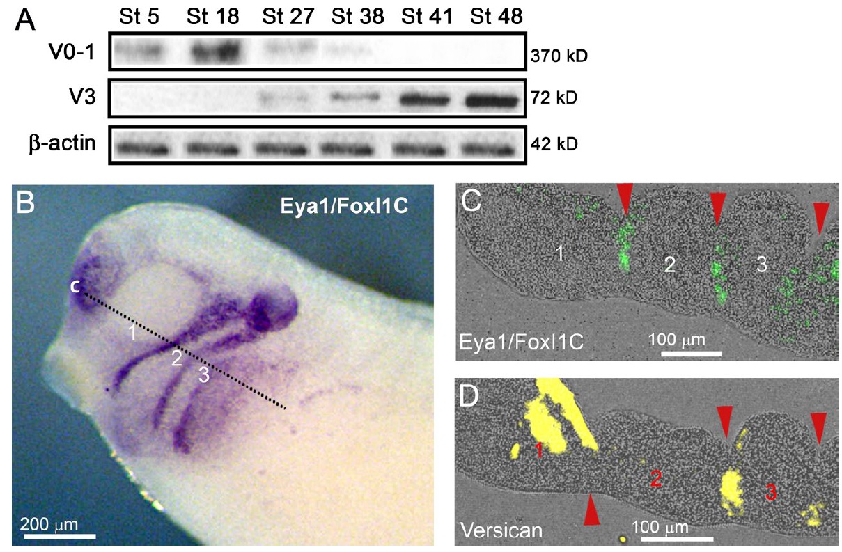 Figure S1. Versican is expressed in tissues that surround the migrating NC, related to Fig. 1. (A) Western blot analysis of extracts from control Xenopus embryos at stages 5, 18, 27, 38, 41, and 48. β-Actin was used as a loading control. Quantification by densitometry is shown in Fig. 1 B. (B) Wholemount ISH of stage 28 Xenopus embryos, with a lateral view comparing the expression of Eya1/FoxI1C marking the tissues adjacent to the NC. Black line indicates the level of sections. (C) Section showing Eya1/FoxI1C expression. (D) Section showing Versican expression. The first, second, and third arch are labeled (1â3; migrating NC streams) |