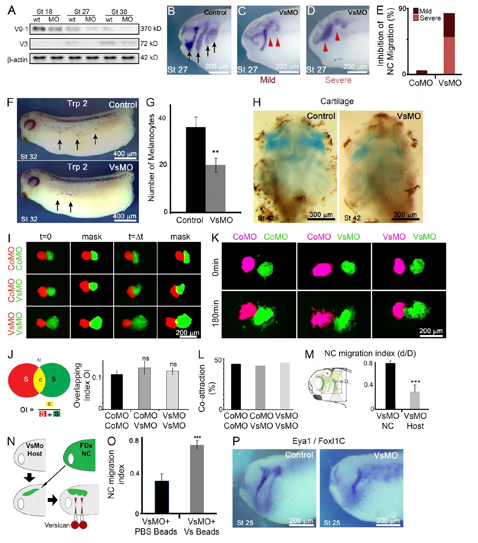 Figure S2. Inhibition of versican leads to failure in NC migration, related to Fig. 2. (A) Western blot of extracts from wild-type (wt) embryos and embryos injected at the two-cell stage with 30 ng VsMO in each blastomere, harvested during NC migration. Lysates were probed with antibodies specific for the versican V0â1 and the V3 isoforms. β-Actin was used as a loading control. (BâE) Versican MO inhibits NC migration in vivo. Lateral view of stage 27 embryos, anterior to the left, showing that in comparison with control NC migration (B, arrows), versican depletion can result in mild (C) or severe (D) inhibition of NC migration (red arrowheads). (E) Quantification of NC migration inhibition in versican-depleted embryos (VsMO; dark brown represents mild phenotype [32%], light brown represents severe phenotype [49%, total n = 214]) compared with control (CoMO; dark brown represents mild phenotype 5%, n = 124). (F) Lateral view of control or VsMO-injected 32 Xenopus embryos at stage 32 revealing melanocytes (arrows) and NC derivative population. (G) The mean number of melanocytes is significantly reduced upon VsMO injection. Bars, SD. (H) Cartilage, another NC derivative, is affected in VsMOinjected embryos at stage 42 (ventral view). (I and J) Contact inhibition of locomotion is unaffected in NC explants in a confrontation assay. Clusters without CIL are expected to mix and form a larger overlap area (overlapping index [OI] â¼0.5), and the lack of overlap is indicative of the presence of CIL (Becker et al., 2013). Bar, mean; error, SD; n = 23 pair of clusters per condition. (K and L) Coattraction of NC clusters explanted from two embryos onto fibronectin substrates is unaffected by VsMO in a CoA assay (Carmona-Fontaine et al., 2011). (M) Quantification of migration index as MI = d/D. Migration index in control host embryos with VsMO-injected NC grafts and control NC in VsMO-injected host embryos show that versican depletion in the surrounding tissues leads to significant reduction in NC migration. Bar, mean; error, SD. (N and O) Rescue of NC migration by versican protein. (N) NC expressing GFP were grafted into a VsMO-injected embryo, which impairs NC migration. In some embryos, microbeads soaked with versican protein were grafted at the border of the presumptive NC streams. (O) Migration index in embryos with beads soaked in PBS (n = 4) or versican (n = 5). Bar, mean; error, SD. Note that grafts of versican-soaked beads at the stream borders lead to a significant rescue of NC migration. (P) Placode localization is affected by VsMO injection, shown in ISH of a representative stage 25 embryo using Eya1/FoxI1C (88%, n = 24). ***, P < 0.001; **, P < 0.01; ns, not significant. |
