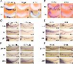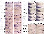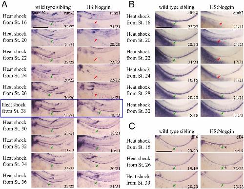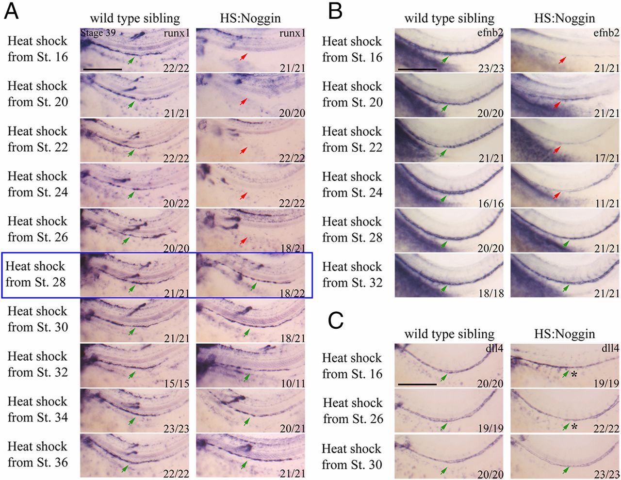 Fig. 3. BMP is required for the specification of hemogenic endothelium before stage 28. (A) Runx1 WISH of heat-shock time course. Runx1 expression is abolished in HS:Noggin siblings when BMP signaling is inhibited before stage 28 (blue box). Arrows mark runx1 expression along the DA, with green arrows indicating normal expression levels and red arrows indicating absent or decreased expression. Expression of runx1 is unaffected when the treatment is started at stage 28 or afterward. Runx1 is also expressed in lateral line nerves (*) as well as in some motor neurons (*), the staining of which in some images is overlaid with runx1 staining in the DA due to embryo positioning and focus. (B) Efnb2 expression is strongly reduced in HS:Noggin siblings when BMP signaling is blocked before stage 28. (C) Dll4 expression is relatively normal in HS:Noggin siblings. However, the DA is not properly lumenized (*) when BMP signaling is inhibited before stage 28. Embryos were visualized from the lateral view, zoomed in to the trunk region, with anterior to the left and dorsal at the top. Proportion of embryos which the image represents is shown in bottom right corner. (Scale bars: 0.5 mm.) |