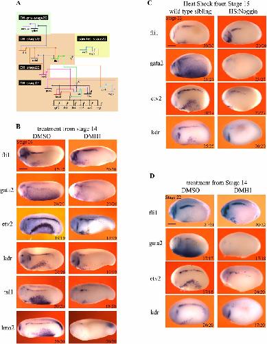 Fig. S4. Bmp signaling is required for gata2 expression in the DLP. (A) GRN summarizing the known requirements for the programming of DH in the DLP. The timing and tissue of expression is shown by the position of the gene name with gene inputs shown as arrows. Note that arrows do not necessarily signify direct interactions but indicate requirements for expression. Where two gene products physically interact for the expression of a target, their arrows converge on chevrons for receptor ligand interaction or a circle for interactions between transcription factors. Where a gene is shown twice indicates a change in its regulation (gata2 is initiated by fli1 but later requires etv2 for its maintenance). (B) Hematopoietic programming in the DLP, at stage 26, following DMH1 treatment from stage 14. Embryos were treated with 100 μM DMH1 from stage 14 and were collected for analysis at stage 26. WISH was used to stain cells expressing genes that are essential for hematopoietic programming in the DLP: fli1, gata2, kdr, etv2, tal1, lmo2, and hex. Embryos are shown in lateral view, with anterior to the left and dorsal at the top. Red arrowheads mark staining in the DLP. (C) Hematopoietic programming in the DLP at stage 22, following heat shock-induced noggin expression at stage 14. The expression of fli1 in the DLP is unchanged, whereas etv2 is expressed at reduced levels and gata2 and kdr are absent (red arrowheads). Embryos were heat-shocked for 15 min at 35 °C at stage 14 and were collected for analysis at stage 22. WISH was used to stain cells expressing genes that are essential to hematopoietic programming in the DLP: fli1, gata2, kdr, and etv2. (D) Hematopoietic programming in the DLP at stage 22, following DMH1 treatment from stage 14. The expression of fli1 in the DLP is unchanged, whereas etv2 is expressed at reduced levels and gata2 and kdr are absent. Embryos were treated with 100 μM DMH1 from stage 14 and were collected for analysis at stage 22. WISH was used to stain cells expressing genes that are essential for hematopoietic programming in the DLP: fli1, gata2, kdr, and etv2. Embryos are shown in lateral view, with anterior to the left and dorsal at the top. Numbers on individual images show the proportion of embryos that the image represents (Bottom Right). Images and numbers are from one experiment and are representative of two biological replicates. |