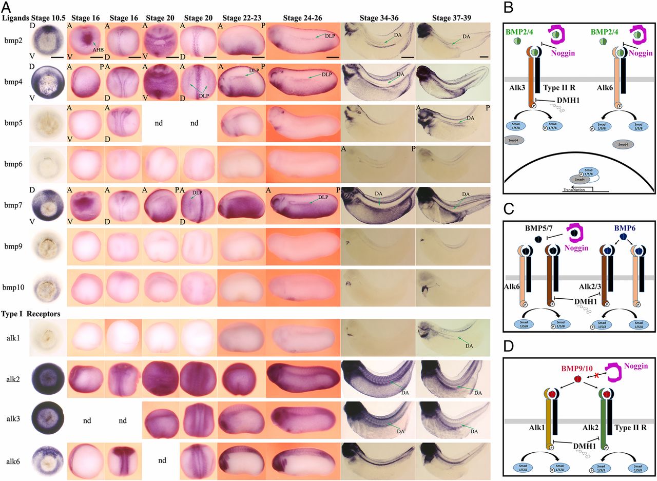 Fig. 1. Expression analysis of BMP ligands and receptors from midgastrulation stage to hemogenic endothelium formation and the description of reagents to inhibit all BMP signaling in blood ontogeny. Primarily, expression in tissues involved in blood stem cell lineage is described. (A) Ligands: bmp2, bmp4, and bmp7 are the principal BMP ligands expressed during gastrulation and onward. At stage 10.5, midgastrulation, bmp2 is expressed in the dorsal mesendoderm. At stage 16, early neurula, bmp2 expression is localized to anterior ventral mesoderm, which encompasses cardiac progenitors and anterior hemangioblasts (AHB). At stage 20â23, bmp2 is expressed along the ventral mesoderm and in lateral plate mesoderm, with signal tapering toward the DLP mesoderm. At stage 26, bmp2 expression is localized along the DLP as well as ventral and cardiac mesoderm. At stages 34â39, bmp2 is expressed in the DA. At stage 10.5, bmp4 is expressed in mesendoderm, with expression diminishing toward dorsal mesendoderm. At stage 16â20, bmp4 is expressed extensively in ventral and lateral mesoderm. From stage 20 onward, bmp4 expression is localized to DLP, encompassing future hemangioblast. At stages 21â26, bmp4 expression is strong along the ventral and lateral plate mesoderm, specifically delineating the DLP tissue at the dorsal most expression domain. At stage 34, bmp4 is expressed in the DA. Bmp5 is not expressed in tissues related to blood lineages, except at stage 38â39, when it is expressed in the DA. Bmp6 is not expressed in HSC lineage. The only expression detectable is transiently in kidney tubules at stage 36. Bmp7 expression at stage 10.5 is localized to ventral most mesendoderm as well as a subset of dorsal mesendoderm. At stages 16â26, bmp7 is expressed along the ventral and lateral plate mesoderm, bordering the kidney field in the dorsal most extent. Bmp7 is strongly expressed in the lateral plate mesoderm for the rest of the developmental stages analyzed. From stage 34 onward, bmp7 is also expressed in the DA. Bmp8 is not expressed during Xenopus development. Bmp9 and bmp10 are expressed in the heart from stage 26 onward. Type I receptors: alk1 is not expressed in early time points; later alk1 expression is primarily restricted to the heart and at stage 38â39 to DA. Alk2 and alk3 are ubiquitously expressed at all stages analyzed. From stage 34 onward, their expression is also observed in the DA. Alk6 is not expressed in blood stem cell lineage but is widely expressed early in dorsal mesoderm and later in neural tissues, neural crest, somites, and notochord. Embryos at stages 10.5 and 34â39 are cleared to enable visualization of the staining of the deeper tissues. For stage 10.5 embryos, D is dorsal and V is for ventral side. For stages 16â20, embryos are visualized from anterior-dorsal (A-D) and anterior-ventral (A-V) angles, except stage 16 bmp4 staining, which is documented from anteriorâposterior (A-P) lateral view. From stage 21 onward, the pictures of embryos are taken from lateral view, with anteriorâposterior labeled, where it is relevant, on the figure. Expression profile was not determined (nd) for some stages. (Scale bars: 0.5 mm.) (B) BMP2 and BMP4 signal through type I receptors, Alk3 and Alk6. Noggin inhibits signaling by preventing ligands from binding to receptors. DMH1 blocks signaling downstream of Alk3 but not Alk6. (C) BMP5, -6, and -7 signal through type I receptors Alk2, Alk3, and Alk6. Noggin blocks binding of BMP5 and -7 to type I receptors. Noggin does not inhibit signaling downstream of BMP6. DMH1 inhibits Alk2 and Alk3 but not Alk6. (D) BMP9 and -10 signal through type I receptors Alk1 and Alk2. Noggin does not block BMP9 or -10 from binding to receptors. DMH1 blocks Alk1 and Alk2 receptor activity. |