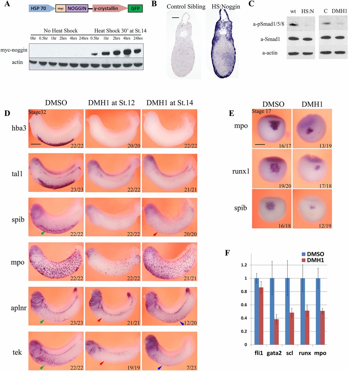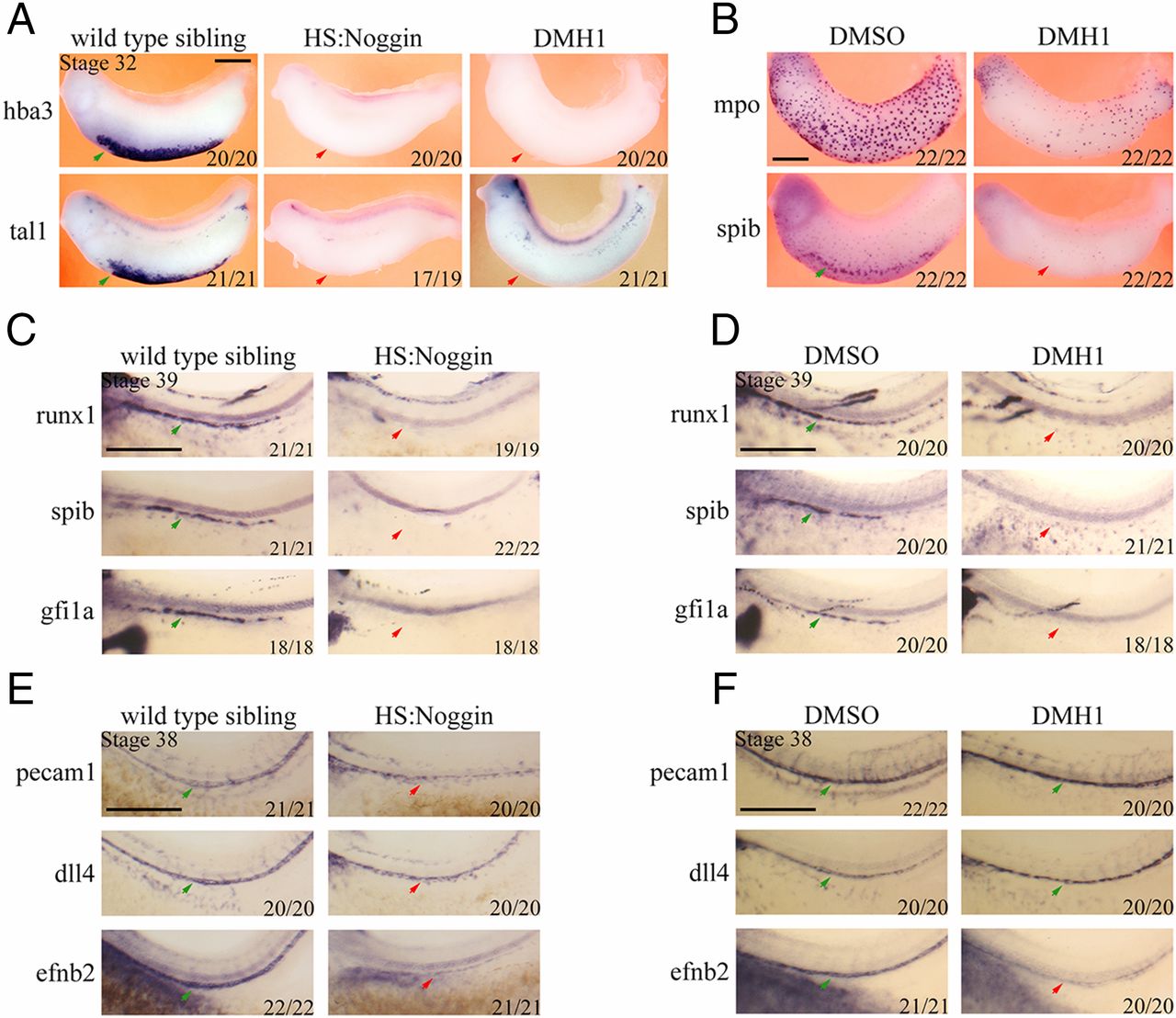 Fig. 2. BMP signaling is required for definitive and primitive hematopoiesis in Xenopus laevis. (A) Noggin protein induced by heat-shock treatment at stage 14 leads to a complete loss of tal1 and hba3 expression in ventral blood islands (arrows) in HS:Noggin transgenic Xenopus stage 32 embryos. Similarly, DMH1 treatment starting from stage 14 blocks tal1 and hba3 expression. (B) Inhibition of BMP signaling by DMH1 from stage 14 abrogates expression of myeloid blood markers mpo and spib at stage 33 compared with DMSO-treated control. (C and D) Inhibition of BMP signaling from stage 14 by Noggin (C) or DMH1 (D) results in the loss of expression of hemogenic endothelium markers runx1, spib, and gfi1a in the DA (red arrow for absence of in treated, green arrows for normal expression in control embryos). (E and F) The endothelium marker pecam1 and arterial gene dll4 is expressed in control as well as treated samples, albeit slightly lower in HS:Noggin embryos. The arterial marker efnb2 is severely reduced in either HS:Noggin-expressing or DMH1-treated embryos (red arrows in E and F). The stages at which the in situ hybridization was performed are indicated on the top left corner. Embryos were photographed from a lateral view, with anterior on the left and dorsal at the top. Numbers in bottom right corner indicate proportion of embryos displaying the phenotype. (Scale bars: 0.5 mm.) |