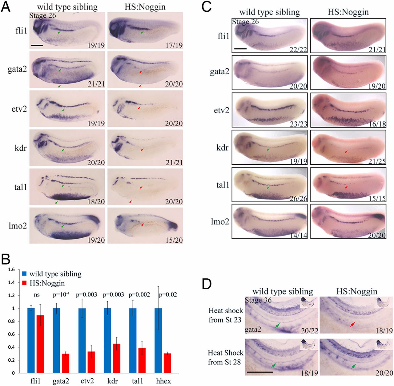 Fig. 4. BMP signaling is required for gata2 expression in the DLP transcriptional network. (A) Hematopoietic programming in the DLP, at stage 25, following heat shock-induced noggin expression at stage 15. Embryos were heat-shocked for 15 min at 35 °C at stage 15 and were collected for analysis at stage 25. Fli1 expression is unaffected in the DLP (green arrows), whereas gata2, kdr, tal1, and lmo2 expression is absent in the DLP as well as ventral blood island (VBI) (red arrows) of HS:Noggin transgenic siblings. Etv2 expression is decreased in the DLP and is absent in VBIs (red arrow). Numbers on individual images show the proportion of embryos for which that image represents (bottom right). (B) qPCR analysis of hemangioblast genes in stage 25 DLPs dissected from control and heat-shock noggin transgenic embryos. Fli1 is not significantly affected, whereas all of the other genes quantified show significant decreases of expression. (C) Hematopoietic programming in the DLP, at stage 26, following heat shock-induced noggin expression at stage 20. The expression of fli1, gata2, etv2, and lmo2 is unaffected. The expression of kdr and tal1 is reduced in the DLP hemangioblasts. HS:Noggin transgenic siblings were identified by the expression of Noggin transcripts (uniform Fast Red staining in HS:Noggin embryos). (D) Gata2 expression in the DA, at stage 36, following heat shock-induced noggin misexpression at stages 23 and 28. Gata2 expression is absent in the DA of HS:Noggin transgenic siblings when heat shock is done at stage 23 (red arrow), whereas gata2 is expressed in the DA of HS:Noggin siblings when heat shock is done at stage 28, compared with wild-type siblings (green arrows). The stage of the embryos are indicated in the top left corner of the top left image. Numbers on individual images shows the proportion of embryos that the image represents (Bottom Right). Images and numbers are from one experiment and are representative of two biological replicates. (Scale bars: 0.5 mm.) |