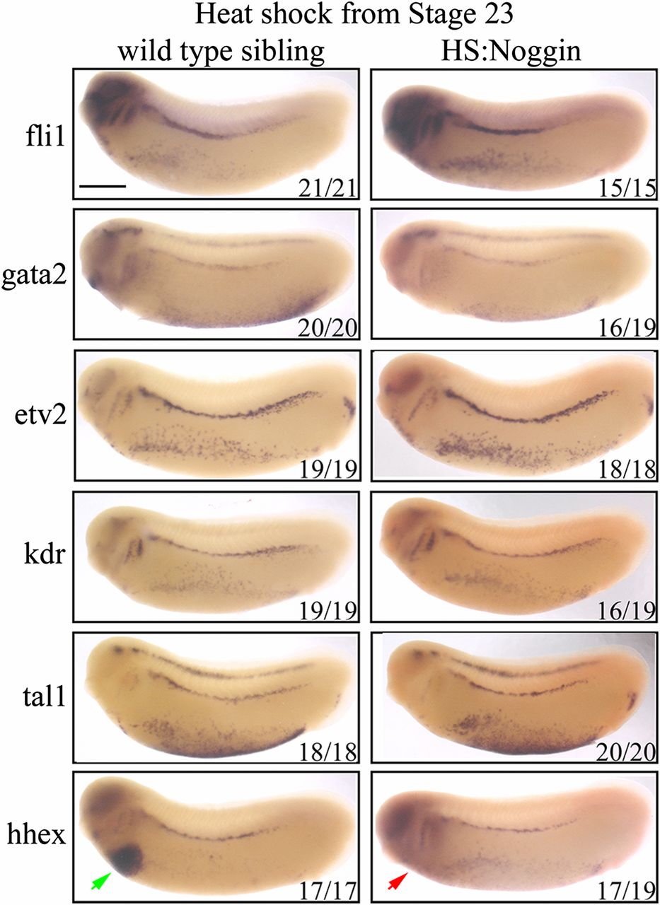 Fig. S5. BMP signaling is not required for GRN of the DH after stage 23. Hematopoietic programming in the DLP, at stage 26, following heat shock-induced noggin expression at stage 23. The expression of hemangioblast genes are unaffected in the DLP. The expression of hhex gene is absent in the liver primordium (red arrow) in HS:Noggin siblings compared with wild-type siblings (green arrow). Embryos were heat-shocked for 15 min at 35 °C at the stage 23 and were collected for analysis at stage 26. WISH was used to stain cells expressing genes that are essential for hematopoietic programming in the DLP; fli1, gata2, kdr, etv2, tal1, and lmo2 together with noggin transgene transcripts. HS:Noggin transgenic siblings were identified by the expression of Noggin transcripts (Uniform Fast Red staining in HS:Noggin embryos). |