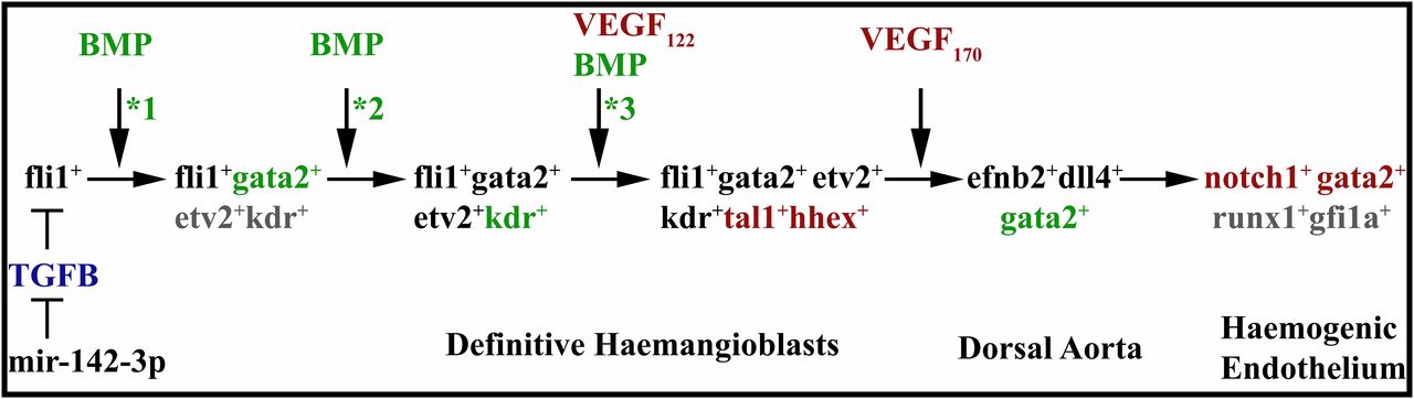Fig. 5. Summary of signaling events and downstream transcription factors driving specification of the blood stem cell lineage. The hemangioblast GRN commences with the expression of fli1, which is genetically upstream of gata2 and flk1/kdr (9). Meanwhile, TGFB signaling has an inhibitory effect on fli1 expression (44). BMP signaling, presumably through activation Smad transcription factors, together with Fli1, is first required for gata2 expression before stage 20 (*1) and then for kdr expression at stage 20 (*2) (current study). The genes that are affected consequentially at those stages are colored gray. VEGFA small isoform (VEGFA122) then activates Kdr receptor which lead to the expression of scl/tal1 and hhex (14). Finally, BMP signaling is still required at stage 23â26 for the initiation of gata2 expression later in the DA (*3) (current study). Later, VEGFA medium isoform (VEGFA170) from somites induces Notch1, which in turn is required for the maintenance of gata2 expression and induction of runx1 (14). The requirements for each signaling pathway are indicated by color-matching the text with the transcription factors. The three inputs from BMP signaling are shown with asterisks (*). |