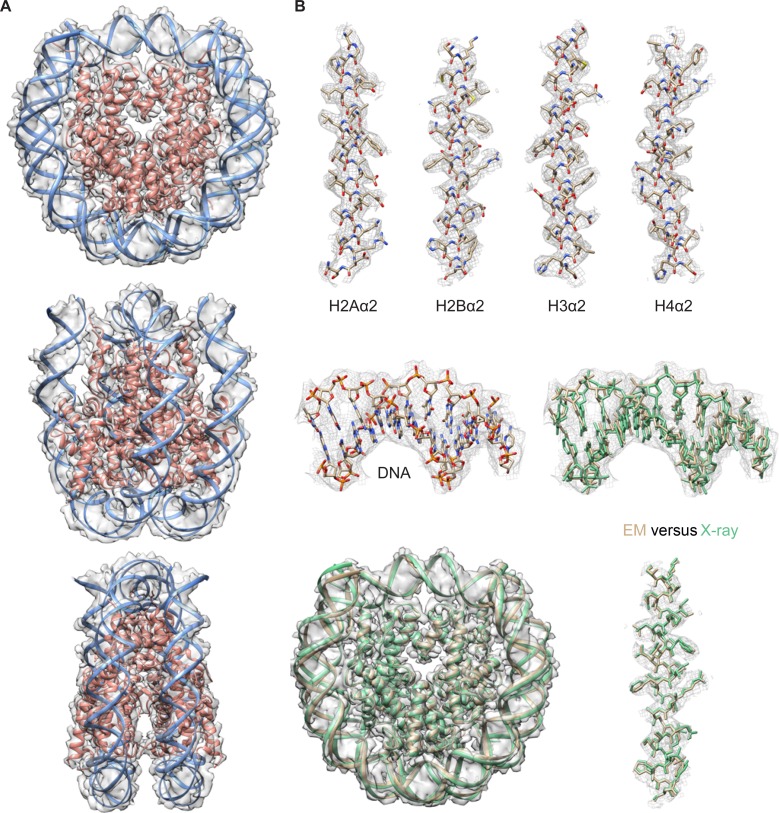 Figure 3. 3.9 Å phase-plate cryo-EM structure of the Nucleosome Core Particle (NCP). (A) Three views of the EM map (surface rendered in grey) and the refined EM model (cartoon representation). The disk view (top) and the tilted view (middle) is related by a 60° rotation about the vertical axis. The disk view (top) and the side view (lower panel) is related by a 90° rotation about the vertical axis. The DNA is shown in blue and histone octamer in pink. (B) Close-up views of histone helices and the DNA dyad. Also shown is a comparison of the EM model (gold) and the X-ray model (green; PDB ID 3LZ0) displaying a similar arrangement of the histone core and small differences in DNA conformations at the entry/exit site of the NCP.