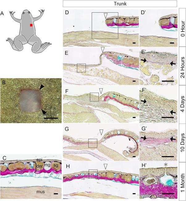Trunk-skin regeneration and wound healing after excision. A: Illustration of a metamorphosed froglet; the red rectangle shows the location for skin excision. B: The skin wound immediately after excision. C: A section of intact trunk skin stained with Elastica van Gieson and Alcian blue. Epi, epidermis; der, dermis; mg, mucous gland; sg, serous gland; mus, muscle (n = 4). D'–G': Magnified views of the rectangles in D–G. Time after incision: D,D', 0 hr (immediately after skin excision) (n = 4); E,E', 24 hr (n = 4); F, F', 4 days (n = 4); G,G' 10 days (n = 4); H,H', 1 month after excision (n = 3). Black arrowheads (B) indicate the wound site. Open arrowheads (D–H) indicate the right-hand border of the wound. Black arrows (E'–G') indicate the basement membrane of the epidermis. Asterisk (H') indicates an exocrine gland duct. B: Bar = 1 mm. C–H,D'–H': Bar = 50 µm.