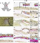 Head-skin regeneration and wound healing after excision. A: Illustration of a metamorphosed froglet; the red rectangle shows the excision location. B: The skin wound immediately after excision. C: A section of intact head skin, stained with Elastica van Gieson and Alcian blue. Epi, epidermis; der, dermis; mg, mucous gland; sg, serous gland; sku, skull (n = 4). D'–H': Magnified views of the rectangles in D–H. Time after excision: D, D', 0 hr (immediately after excision) (n = 3); E,E', 24 hr (n = 5); F,F', 4 days (n = 5); G,G', 10 days (n = 5); H,H', 1 month after excision (n = 4). Black arrowheads (B) indicate the wound site. Open arrowheads (D–H) indicate the right-hand border of the wound. Black arrow (G') indicates maturing secretion gland. B: Bar = 1 mm. C–H, D'–H': Bar = 50 µm.