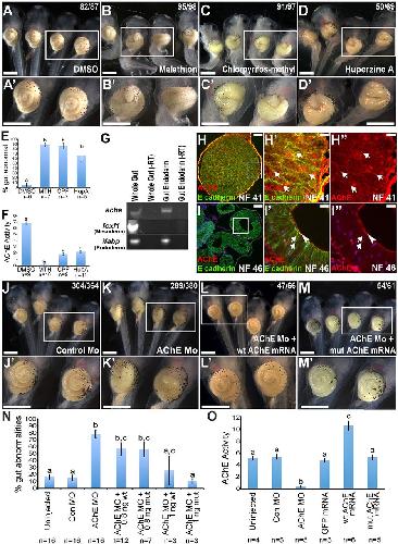 Fig. 1. AChE plays a non-neuronal, non-esterase role in intestine organogenesis. Normal intestinal elongation and rotation are observed in DMSO-exposed control tadpoles (A,Aâ²). Exposure to malathion (MTH; B,Bâ²), chlorpyrifos-methyl (CPF; C,Câ²) or Huperzine A (HupA; D,Dâ²) increases the percentage (E) of tadpoles with short/malrotated intestines. AChE activity assays (F) confirm that the applied compounds inhibit AChE in vivo. RT-PCR (G) indicates that isolated intestinal endoderm (indicated by the expression of ifabp, but not foxf1) expresses ache. âRT, control lacking reverse transcriptase. At NF 41, AChE (red) colocalizes with E-cadherin (green) at endoderm cell membranes (H-Hâ², arrows). By NF 46, AChE is apically enriched (I-Iâ², arrowheads), with reduced lateral membrane expression (arrows). Intestinal development is normal in control MO-injected embryos (J,Jâ²,N), whereas microinjection of AChE MO results in short/malrotated intestines (K,Kâ²,N). Intestinal malformations are rescued by co-injection of RNA encoding wt AChE (L,Lâ²,N) or mutAChE that lacks catalytic activity (M,Mâ²,N). AChE activity assays (O) confirm that AChE MO knocks down AChE, that wt AChE mRNA increases activity, and that mutAChE mRNA has no effect on AChE activity, relative to controls (uninjected, control MO, GFP mRNA). Higher magnification views of the boxed regions in A-D,H-M are shown in Aâ²-Dâ²,Hâ²-Mâ², respectively. The number of tadpoles with the phenotype shown among the total number of tadpoles in that experimental group is indicated (A-D,J-M). Bar charts show mean±s.e.m. Significant differences between the percentage of tadpoles with abnormal gut phenotypes or between AChE activities from n=3-16 independent experiments (16-30 embryos per condition per experiment) are indicated by lowercase letters (P<0.05). Scale bars: 1000â μm in A-Dâ²,J-Mâ²; 100â μm in H,I; 25â μm in Hâ²-Iâ². |