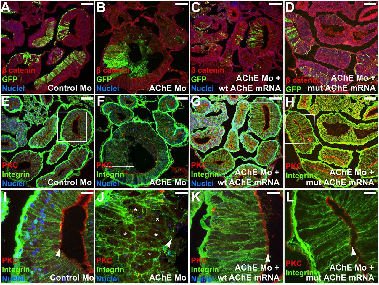 Fig. 2. AChE is required for endoderm cell rearrangement and polarization. In NF 46 intestine sections of embryos injected with control MO (A), AChE MO (B), AChE MO plus wt AChE mRNA (C), or AChE MO plus mutAChE mRNA (D), β-catenin (red) outlines membranes of injected (GFP labeled, green) and uninjected cells. Serial sections from embryos in A-D were immunostained for integrin (green) and aPKC (red) (E-H); the boxed regions are shown at higher magnification in I-L. A single-layer columnar epithelium of polarized cells forms in control MO-injected intestines (I). AChE MO-injected cells (J) are rounder (asterisks), unpolarized [absence of aPKC (red), arrowhead] and fail to form a single layer. Defects are rescued by co-injection with wt AChE mRNA (K) or mutAChE mRNA (L). Scale bars: 100â μm in A-H; 25â μm in I-L. |