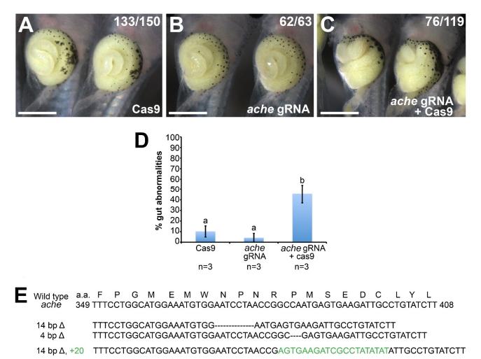 Figure S2) CRISPR-Cas9 mediated editing of ache gene perturbs gut elongation. Xenopus embryos were injected with Cas9 mRNA/protein (A), ache gRNA (B), or Cas9 plus ache gRNA (C), and allowed to develop until stage 46. Relative to injection of Cas9 or ache gRNA alone (A, B), injection of Cas9 plus ache gRNA (C) disrupts intestinal lengthening. Intestine phenotypes resulted from injection of Cas9 plus ache gRNA at both the 1- and 8-cell stages; craniofacial and spinal deformities, similar to those observed with AChE-inhibitor exposure, were also observed in embryos injected at the 1-cell stage (not shown), though absent in 8-cell endoderm targeted injections. The graph (D) indicates the mean (± S.E.M) percentage of embryos in which the intestine is shortened (n=3 different experiments, both 1- and 8-cell injections). E) Genomic sequencing validates the efficacy of CRISPR-Cas9 mediated editing, revealing the presence of deleterious mutations in representative Cas9 plus ache gRNA-injected embryos. Scale bars = 1000 um. |