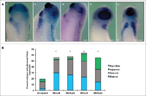 Figure 8. Altering HCN4 expression leads to improper distribution of the homeodomain transcription factor Pitx2. (A) In situ hybridization of representative embryos displaying normal and examples of the most commonly observed Pitx2 expression defects. Uninjected embryos have asymmetric, left-sided expression (i lateral view; iv ventral view). Overexpression and injection of the dominant-negative construct resulted in a variety of molecular phenotypes including expansion or reduction of the endogenous field (ii, iii) and bilateral Pitx2 expression (v). Anterior at top of images. (B) All manipulations caused significantly higher percentages of abnormal Pitx2 expression compared with uninjected embryos (Ï2 = 64.71, df = 4, *p < 0.05). There was no statistical difference between overexpression and dominant-negative phenotypes. n = 54â86 embryos per condition across 3 biological replicates. OE = HCN4-OE, DN = HCN4-DN(AAA). Scale bars = 200 μm. |