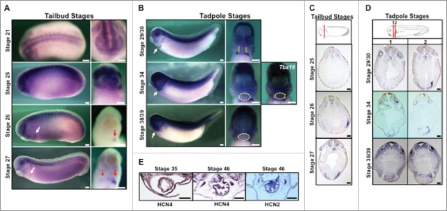 Figure 1. HCN4 expression during embryogenesis (A) In situ hybridization analysis reveals HCN4 is expressed in the developing head and along the dorsal midline at the completion of neurulation embryos (NF stage 21 lateral and frontal views). At early tailbud stages, HCN4 expression is observed primarily in the craniofacial region, in 2 stripes along the neural tube, and in the developing somites. This expression pattern is maintained as development progresses (NF stage 25, lateral and anterior/ventral views). At NF stage 26, HCN4 mRNA begins to be expressed on the left side of the developing heart field (arrow; lateral and ventral views). Expression becomes bilateral beginning at NF stage 27/28 (arrows; lateral and ventral views) but remains more highly expressed on the left side of the body. Scale bars = 200μm. (B) As cardiogenesis progresses during tadpole stages (NF stages 29â39, lateral and ventral views, arrows denote heart), HCN4 expression is diffusely present in the developing myocardium (outlined in yellow dashed lines/circles), but the highest expression is in the septum transversum where other proepicardial genes are expressed (Tbx18, NF stage 34). Scale bars = 200μm. (C,D) Histological sections confirm HCN4 expression in the cardiac mesoderm at tailbud stages, and in the myocardium and proepicardial region in tadpole stages. HCN4 expression can also be observed in the notochord and somites. Red lines in schematic diagrams denote the plane of section. Sections = 10μm, scale bars = 100μm. (E) Immunohistochemistry shows HCN4 protein is expressed at the completion of cardiac looping (NF stage 35) and is expressed throughout the entire ventricle of mature hearts (NF stage 46). Another important cardiac isoform, HCN2, is also found throughout the ventricle of mature hearts, similar to what has been described in mammalian systems. Transverse sections = 15 µm, scale bars = 100 µm. Schematic images are modified from Xenbase.20 |
