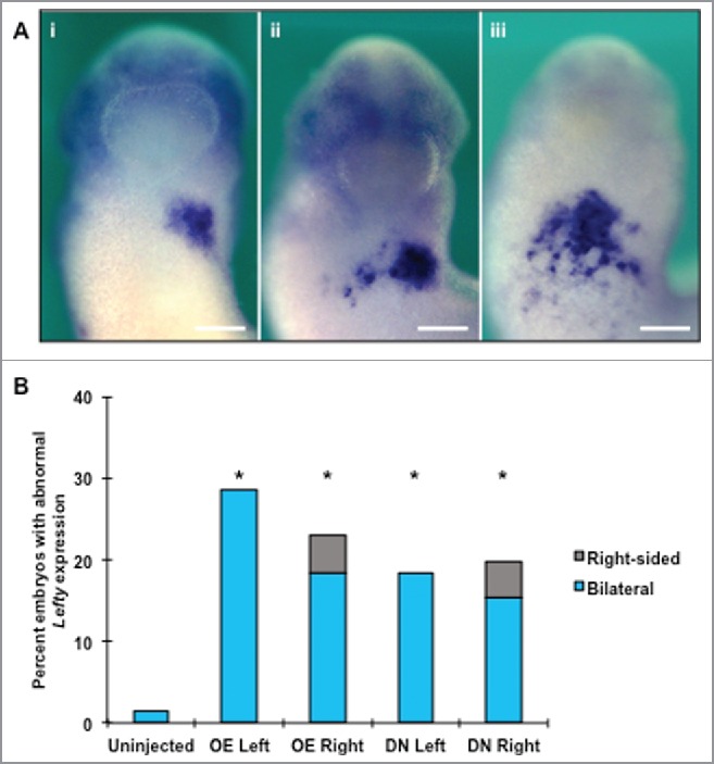 Figure 7. Altering normal HCN4 expression results in aberrant Lefty expression. (A) As visualized via in situ hybridization analysis, Lefty is normally expressed unilaterally in the left lateral plate mesoderm in NF stage 27 embryos (i). Altering HCN4 expression induced both full or partial bilateral and abnormal Lefty expression but did not result in a complete reversal of expression (solely right-sided). One of the most frequently observed bilateral phenotypes was a partial secondary field on the right side of embryos with the midline maintained by an absence of Lefty expression (ii). In the other commonly seen phenotype, Lefty transcripts were expressed across the anterior ventral surface of animals in an undefined shape with no visible midline gap (iii). Images are ventral views with anterior at top. (B) Overexpressing HCN4 and HCN4-DN(AAA) injection led to significant percentages of abnormal embryos compared with uninjected embryos (Ï2 = 19.0086, df = 4, *p < 0.05). There was no statistical difference between overexpression and dominant-negative phenotypes. n = 56â71 embryos per condition across 3 biological replicatesOE = HCN4-OE, DN = HCN4-DN(AAA). Scale bars = 200 μm. |