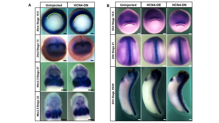 Supplemental Figure 2. Altering HCN4 expression does not disrupt general axis patterning, germ layer specification, or myocardial differentiation. (A) The expression pattern of Xbra, Otx2, and Nkx2.5 in HCN4-DN(AAA) injected embryos was not different from stage-matched, sibling controls as seen by ISH. Representative images are from uninjected sibling controls and HCN4-DN(AAA) one of 2-cell (left) injected embryos. n=30, N=1 for Xbra (vegetal view) and Otx2 (anterior view, dorsal at top). n=25, N=1 for Nkx2.5 (ventral view anterior at top). dorsal lip of blastopore denoted by a yellow dashed line. (B) Shh expression is also not disrupted with injection of HCN4-OE or HCN4-DN(AAA). At gastrulation, Shh is whisker-shaped above the dorsal lip of the blastopore (black line; vegetal view). As development progresses it is found along the midline, in the notochord and somites. n=30, N=1 for stage 10.5 and stage 21 (dorsal view, anterior at top). n=50, N=1 for stage 29/30 (lateral view, anterior at top). Scale bars=200 µm. |