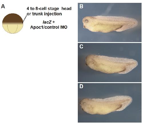 Fig. S1. The apoc1 spMO morphants resulted in identical phenotypes as tbMO morphants. (A) Schematic drawing of the experiment. 40 ng Apoc1 spMO was injected into either the presumptive head (C) or trunk/tail (D). (B) Embryos injected with 40 ng control MO were normal. (C) Injections targeted to the head region resulted in 56.4% (n=55) of the embryos displaying small or missing eyes and head deformation. (D) Injections targeted to the trunk region resulted in perturbed dorsal fin development in 45.2% (n=31) of the embryos. |