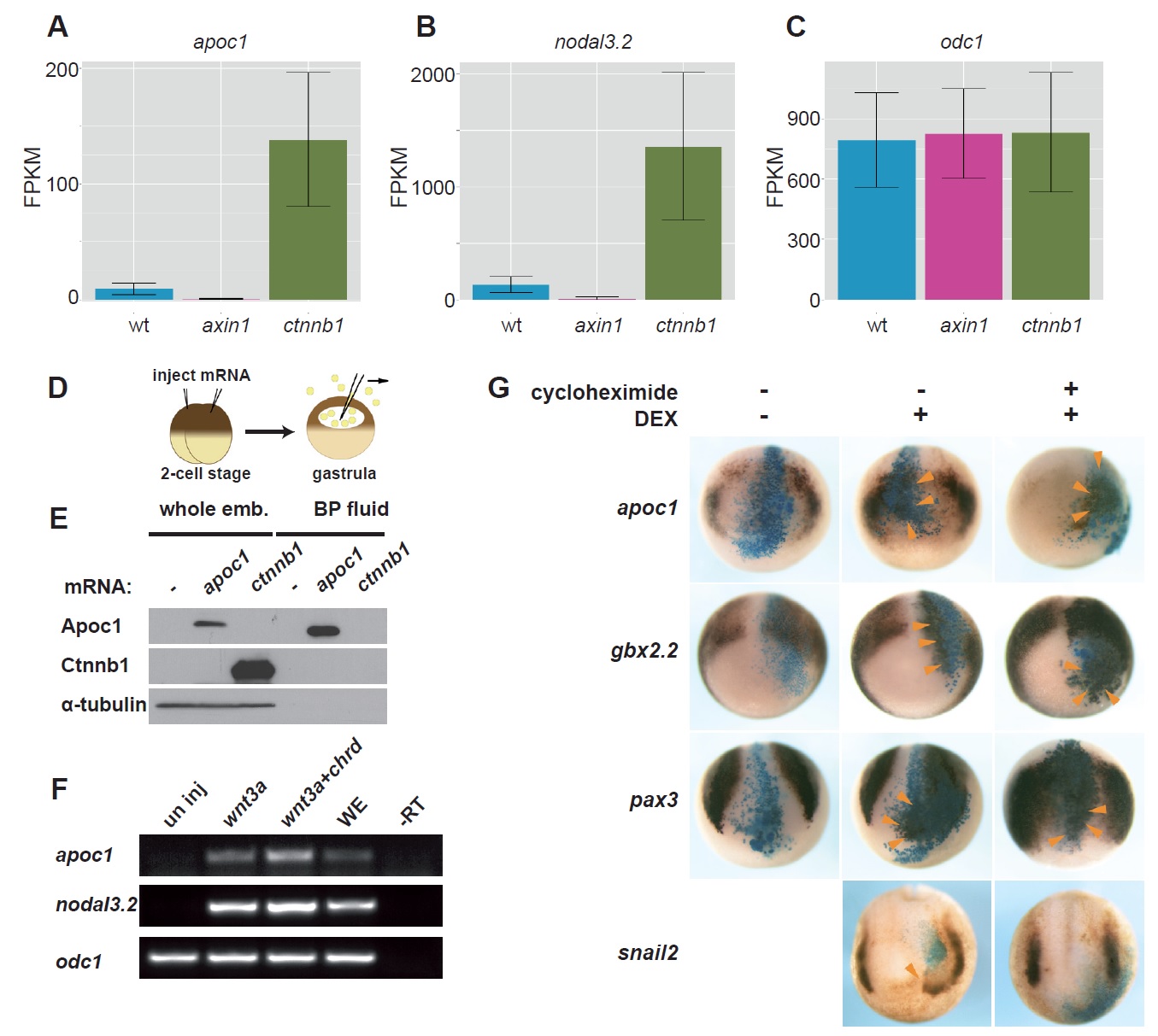Fig. 1. Identification, characterization and regulation of Xenopus apoc1. (A-C) Bar charts showing the expression levels, displayed as fragments per kilobase of transcript per million fragments mapped (FPKM), for apoc1 (A), the Wnt regulated gene nodal3.2 (B), and the non-Wnt regulated gene odc1 (C) in Xenopus tropicalis embryos that were either uninjected (blue), injected with 105 pg axin1 mRNA (pink) or 24 pg <N-HA-ctnnb1 mRNA (green). (D) Schematic drawing of the Apoc1 secretion experiment. mRNA was injected at the two-cell stage. The blastopore fluid was collected at the gastrula stage and subjected to western blot (WB) analysis to determine whether flag-tagged Apoc1 protein is secreted from cells during embryonic development. (E) Apoc1, but not Ctnnb1, protein was detected by WB in the blastocoel fluid after injection of flag-tagged apoc1 (500 pg) and flag-tagged ctnnb1 (1 ng). The tubulin blot shows that there is no cellular contamination in the blastopore fluid. (F) Wnt regulation of apoc1 in Xenopus laevis embryos. (F) 300 pg of wnt3a or 200 pg of chrd and 300 pg wnt3a were injected into the animal side of two blastomeres at the two-cell stage. Animal cap explants were dissected from stage 9 embryos, cultured until stage 10, and processed for RT-PCR analysis. Expression of apoc1, and the known Wnt target gene nodal3.2, was induced by wnt3a alone, and chrd+wnt3a. Odc1 was used as loading control. (G) Apoc1, gbx2.2 and pax3 are immediate-early target gene of Wnt/Ctnnb1 signaling. 200 pg of GR-ctnnb1 and 100 pg lacZ mRNA were injected into one side of a dorsoanimal blastomere of 8-cell stage embryos and the embryos were treated with cycloheximide 30 min prior to DEX treatment at stage 11.5. The expression of apoc1, gbx2.2, pax3 and snail2 were examined by whole mount in situ hybridization. Orange arrows indicate ectopic localization of the tested genes. |