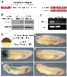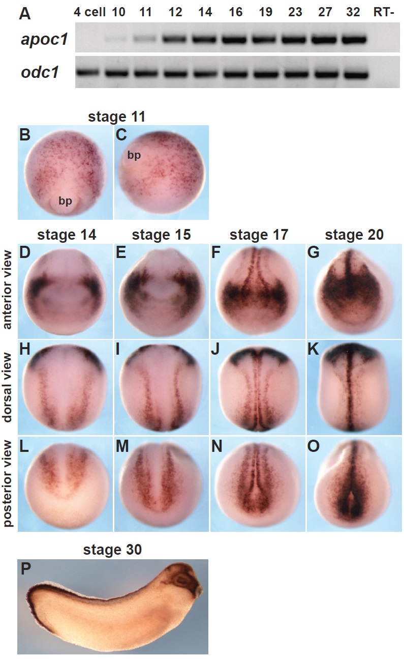 Fig. 2. Spatiotemporal expression pattern of Xenopus laevis apoc1. (A) The temporal expression pattern of apoc1 during Xenopus development (4-cell stage, stages 10-32) was determined by RT-PCR (RT- is without reverse transcriptase from stage 32). (B-P) The spatiotemporal expression pattern of apoc1 determined by whole mount in situ hybridization. (B,C) Apoc1 expression at stage 11; bp - the closing blastopore. Anterior view (D-G), dorsal view (H-K), posterior view (L-O) of stage 14 (D,H,L), stage 15 (E,I,M), stage 17 (F,J,N) and stage 20 (G,K,O) embryos. (P) Lateral view of a stage 30 embryo. |