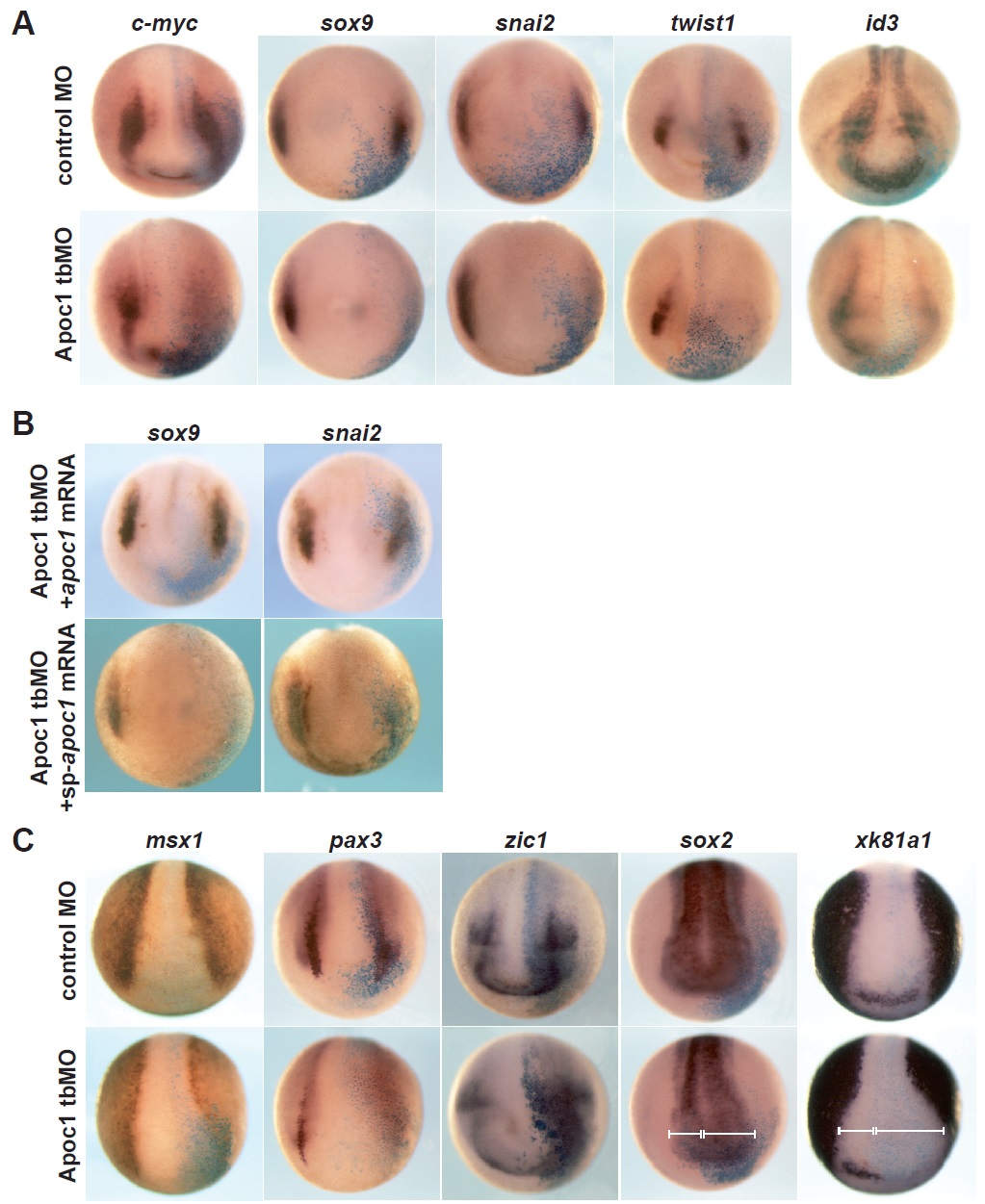 Fig. 4. Apoc1 is required for neural border formation and neural crest emergence. (A) Whole mount in situ hybridization for the neural crest (NC) markers c-myc, sox9, snai2, twist1, id3. Control MO injected embryos are shown in upper panel and Apoc1 tbMO injected ones are shown in lower panel. (B) The reduction of sox9 and snai2 expression by the Apoc1 tbMO could be rescued by coinjection of 400 pg of apoc1 mRNA (upper panel) but not by coinjection of 400 pg of sp-apoc1 mRNA (lower panel). (C) Whole mount in situ hybridization for the neural plate border specifiers msx1, pax3, zic1, the neural marker sox2, and the non-neural ectoderm marker xk81a1. Control MO injected embryos are shown in upper panel and Apoc1 tbMO injected ones are shown in lower panel. One of the dorsal blastomeres was injected with 30 ng of either control MO (upper panels in A, C) or Apoc1 tbMO (lower panels in A, C) together with 100 pg lacZ mRNA. Embryos were fixed at stage 15. The injected side was traced by X-gal staining (blue). |