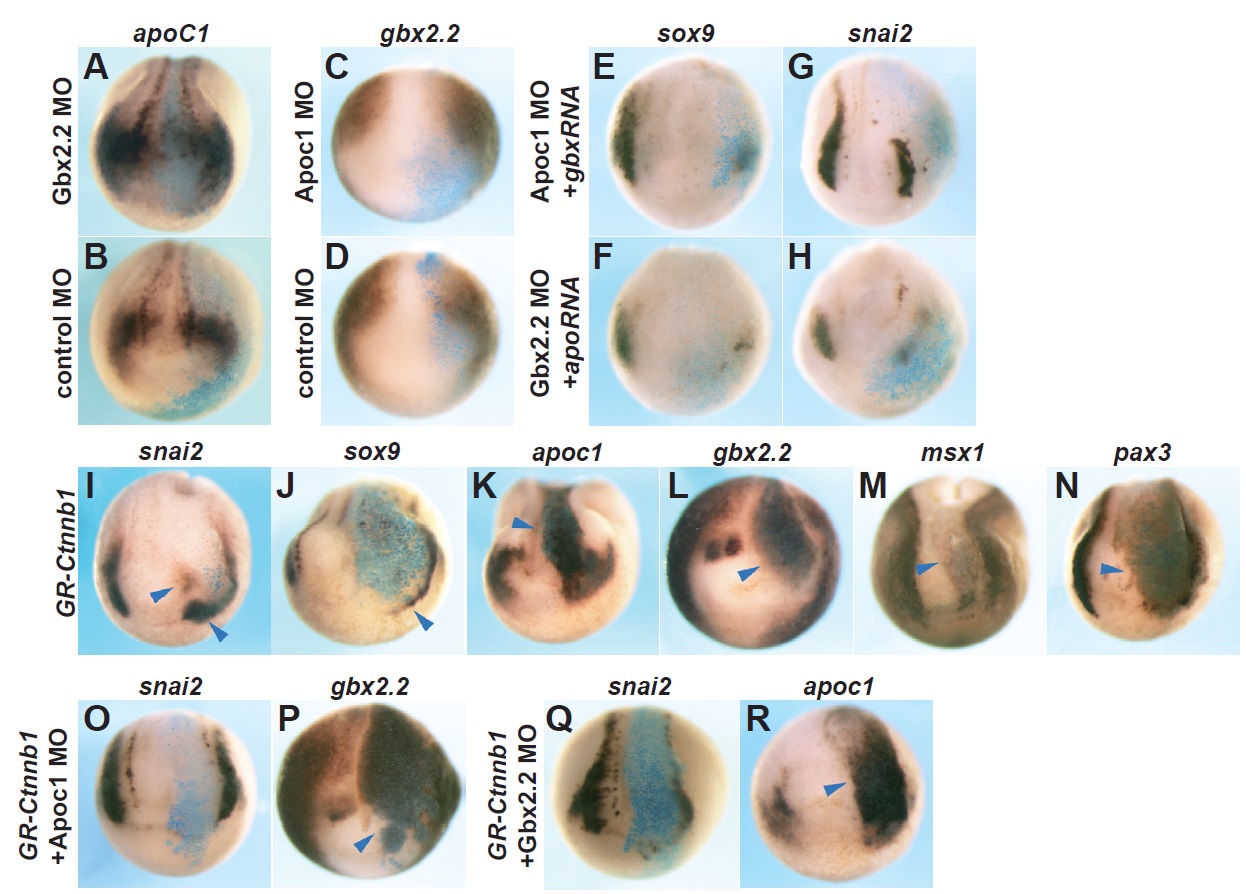 Fig. 6. Apoc1 and gbx2.2 are required for emergence of neural crest cells, but are independently regulated by Wnt signaling. (A-H) The expression of apoc1 and gbx2.2 is independently regulated, but both genes are required for neural crest induction. Apoc1 expression in Gbx2.2 (A) or control MO (B) injected embryos and gbx2.2 expression in Apoc1 (C) or control MO (D) injected embryos. The reduction of sox9 and snai2 expression was not rescued by coinjection of 100 pg gbx2.2 mRNA in Apoc1 (E,G) or 400 pg apoc1 mRNA in Gbx2.2 (F, H) depleted embryos. 30 ng of MO and 100 pg lacZ mRNA was injected into one side of a single dorsoanimal blastomere of 8-cell stage embryos. The embryos were fixed at stage 15. (I-R) Apoc1 and gbx2.2 are both required for Wnt-mediated neural crest induction in vivo. 200 pg of GR-ctnnb1 and 100 pg lacZ mRNA were injected into one side of a dorsoanimal blastomere of 8-cell stage embryos and the embryos were treated with DEX at stage 10.5. The embryos were fixed at stage 15 for whole mount in situ hybridization with snail2 (I), sox9 (J), apoc1 (K), gbx2.2 (L), msx1 (M), and pax3 (N). Ectopic expression of gbx2.2 in GR-ctnnb1 injected embryos was not reduced by coinjecting 30 ng Apoc1 tbMO (P), but the anterior expansion of snai2 was rescued (O). Ectopic expression of apoc1 in GR-ctnnb1 injected embryos was not reduced by coinjecting 30 ng Gbx2.2 MO (R), but the anterior expansion of snai2 was rescued (Q). Blue arrowhead indicates ectopic expression. |