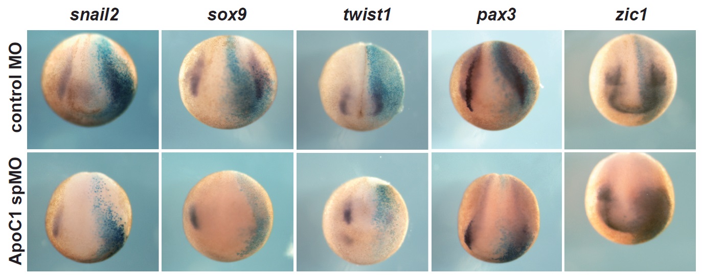 Fig. S2. Apoc1 is required for neural border formation and neural crest emergence. Whole mount in situ hybridization for the neural crest (NC) markers snai2, sox9 and twist1 and the neural plate border specifiers pax3 and zic1. Control MO (40ng) injected embryos are shown in upper panel and Apoc1 spMO (40ng) injected ones are shown in lower panel. Injection of Apoc1 spMO also results in a reduction of the expression of the NC markers as well as the neural plate border specifiers on the injected side. |