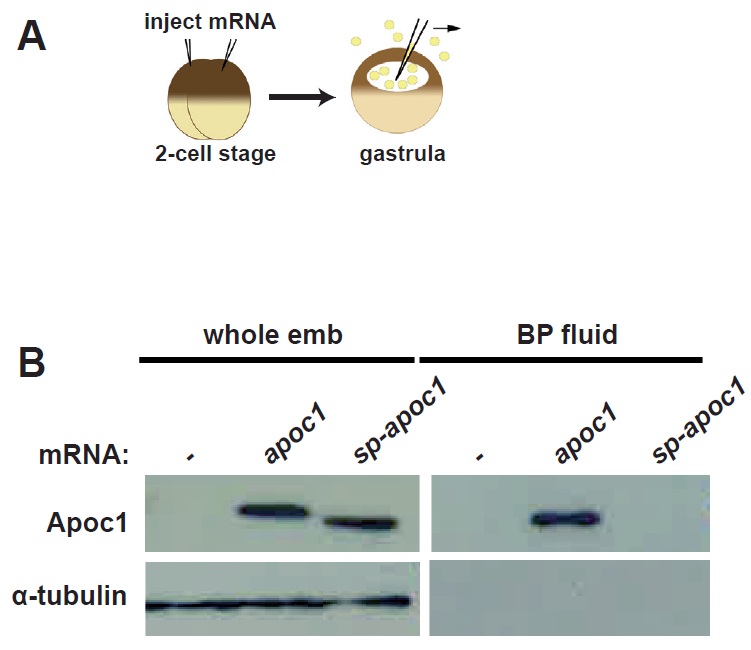 Fig. S3. Apoc1 mutant lacking signal sequence cannot be secreted. (A) Schematic drawing of the Apoc1 secretion experiment. mRNA was injected at the two-cell stage. The blastopore fluid was collected at the gastrula stage and subjected to western blot (WB) analysis to determine whether mutant flag-tagged Apoc1 protein (lacking signal sequence) is secreted from cells during embryonic development. (B) Apoc1, but not mutant protein was detected by WB in the blastocoel fluid after injection of 500pg of flag-tagged apoc1 or flag-tagged mutant apoc1 mRNA. The tubulin blot shows that there is no cellular contamination in the blastopore fluid. |