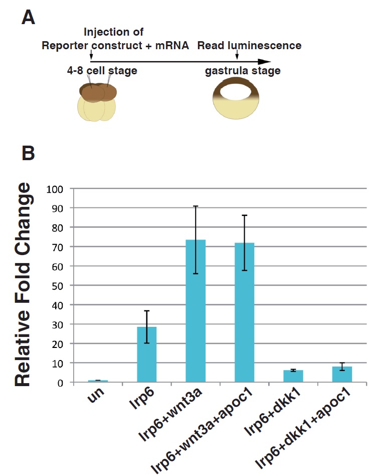 Fig. S4. Apoc1 does not cooperates with extracellular Wnt components to modulates Wnt signaling in TOPFlash assay. (A) Schematic drawing of the experiment. (B) 300 pg of lrp6 mRNA and either 20 pg of wnt3a or 50 pg dkk1 with or without 500 pg of apoc1 mRNA were co-injected with 100 pg of 14XTOPFlash and 25 pg Renilla reporter DNA into 4 to 8cell-stage Xenuous embryos. Firefly and Renilla luciferase were measured at st.10. |