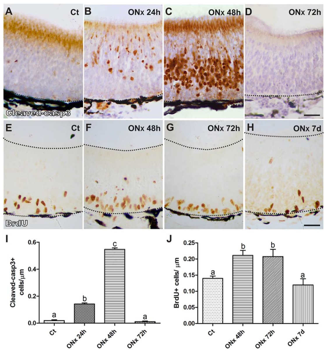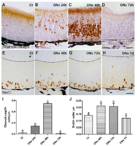 cleaved-casp31 cells per mm of OE perimeter (I) and BrdU1 cells per mm of OE perimeter (J) in