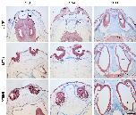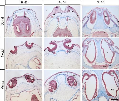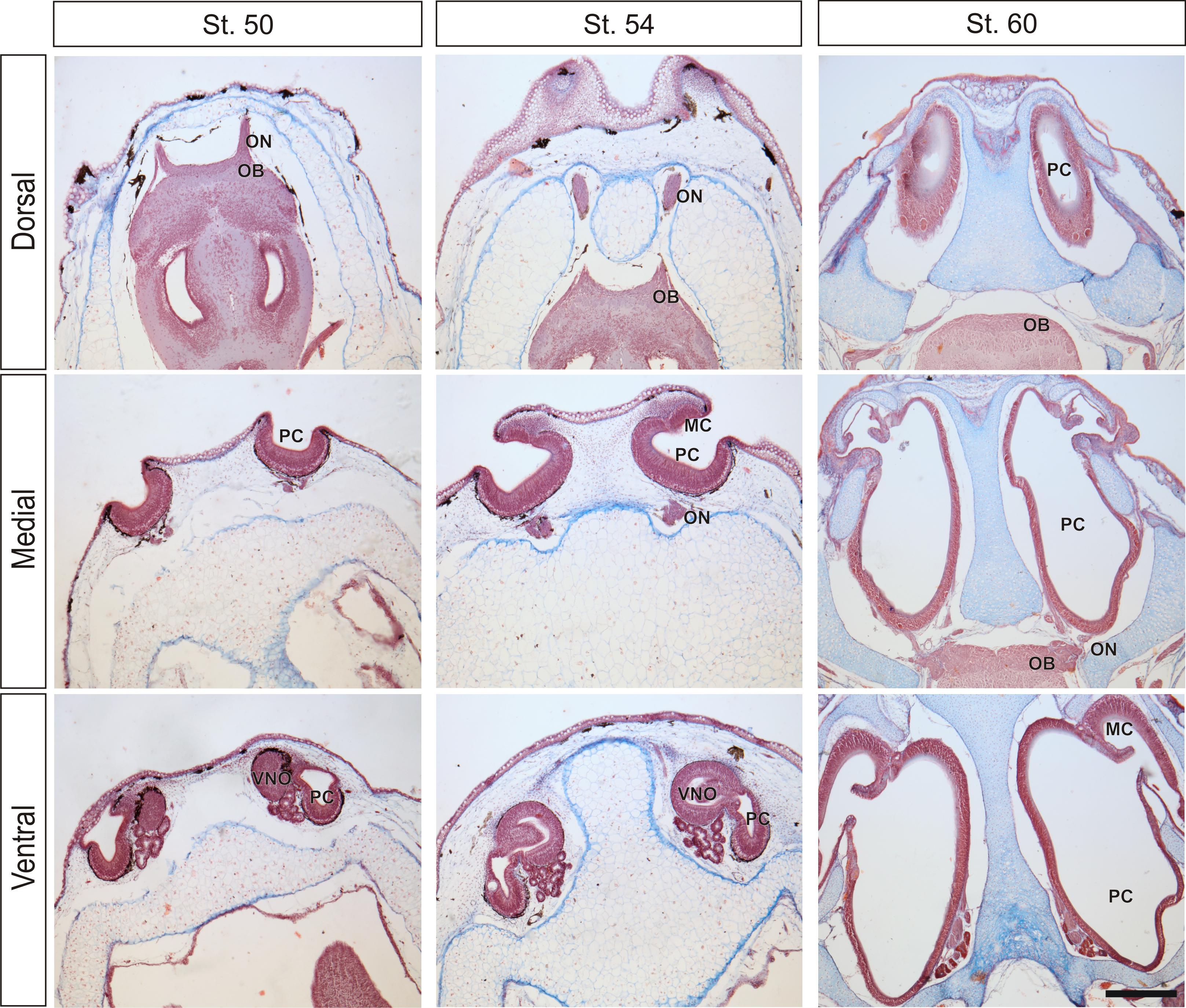Fig. S3. Structure and organization of the olfactory system of X. laevis larvae. Longitudinal sections of X. laevis larvae at premetamorphosis (stage 50 and 54) and metamorphic climax (stage 60); the top row belongs to a more dorsal section, the middle row to a medial section and the lower row to a more ventral section; principal cavity (PC), middle cavity (MC), vomeronasal organ (VNO), olfactory nerve (ON), olfactory bulb (OB); staining: Masson–Goldner’s trichrome stain, scale bar: 100µm. |