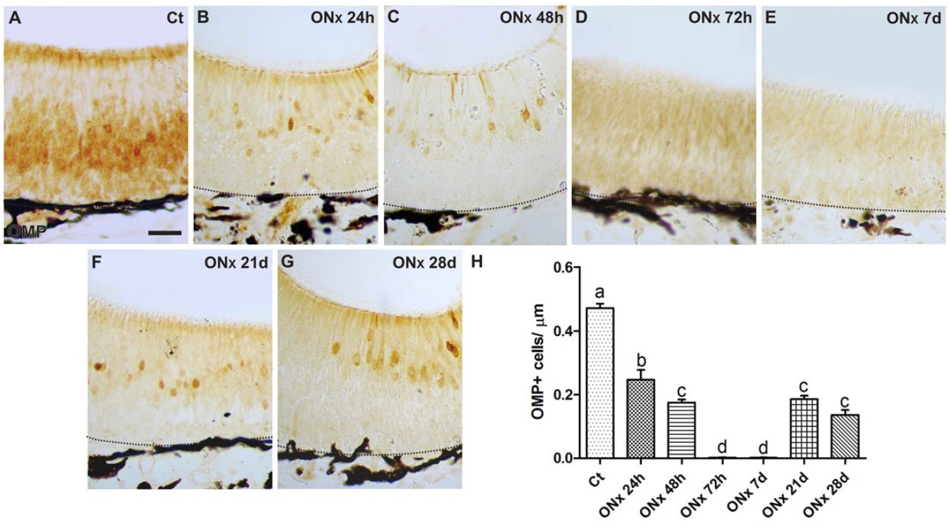 days (E), 21 days (F) and 28 days (G) post-axotomy, scale bar: 20 mm; (H) quantification of OMP1