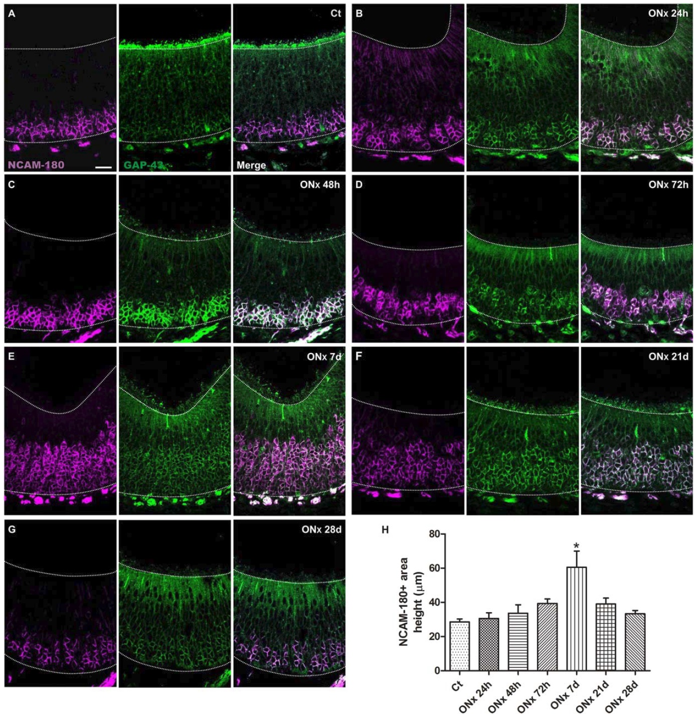 (G) post-axotomy, scale bar: 50 mm; (H) quantification of the NCAM-1801 area height in control