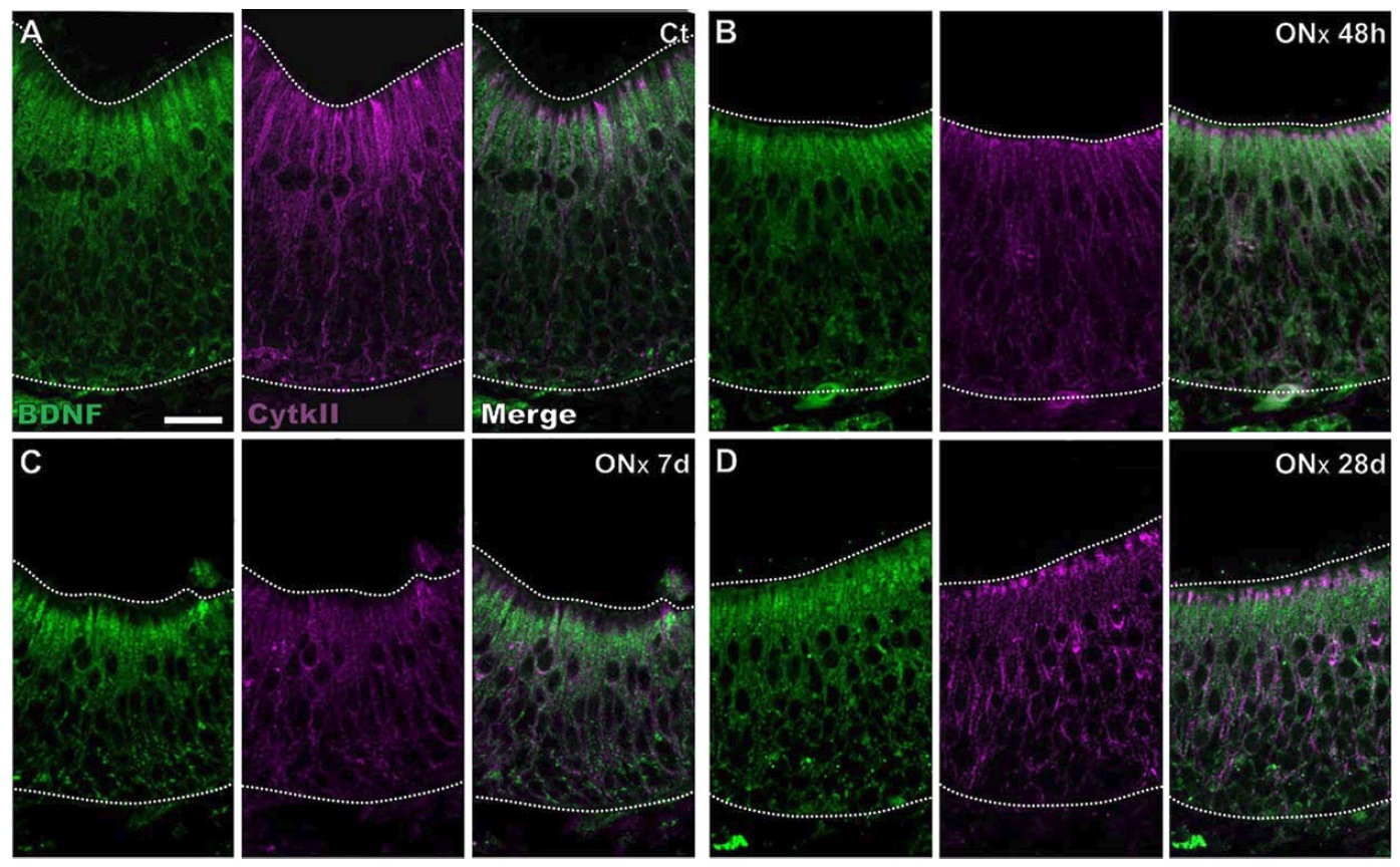 Figure 6 The distribution of BDNF expression in the OE is not altered following axotomy. BDNF