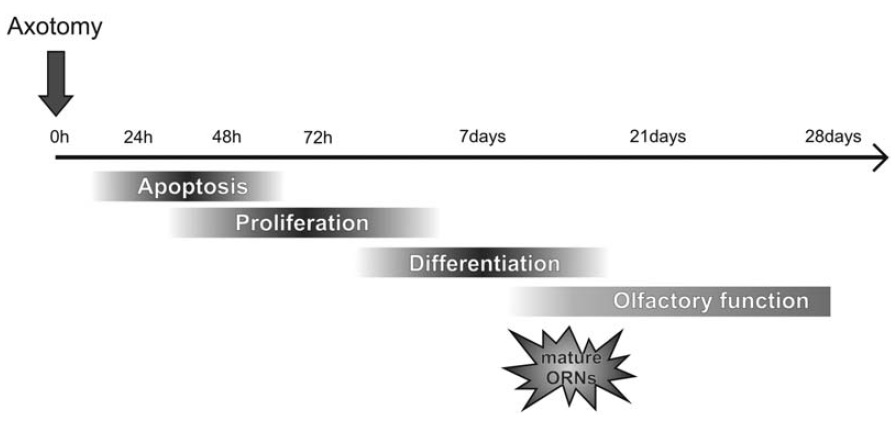 axotomy of the olfactory nerves is summarized in a timeline. The points on the timeline represent