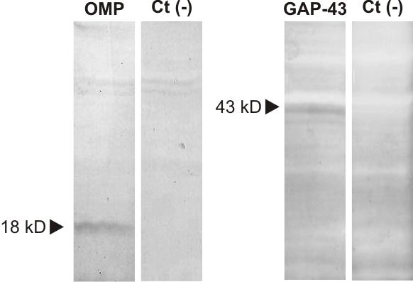Fig. S2. Western blot of OMP and GAP-43 from X. laevis larvae olfactory system showing immune reactive bands of the corresponding molecular weight.