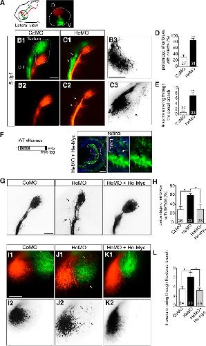 Figure 1. Knock-down of Hermes causes topographic guidance defects of RGC dorsal axons. Zebrafish embryos were fixed at 5 dpf and the eyes injected dorsally (D) with DiI (red) and ventrally (V) with DiO (green) to visualize the retinotectal projections (A). Whole-mount embryos injected with CoMO or HeMO were visualized in lateral (B1, B2, C1, C2) or dorsal view (B3, C3). Hermes-depleted embryos show misprojections of dorsal axons in the medial tract (C1, C2, white arrows) that are not present in embryos injected with CoMO (B1, B2). Quantifications show a significant increase of the percentage of embryos showing misprojections in the OT (D). HeMO-injected embryos show aberrant projection of dorsal axons entering the tectum through the ventral branch (C3) compared with CoMO (B3). Quantifications show that significantly more dorsal axons misroute and enter the tectum through the ventral branch in Hermes-depleted embryos compared with control (E). HeMO-injected embryos were coinjected with a construct expressing full-length myc-tagged Xenopus Hermes (He-myc; F). After 72 hpf, immunostainings show a strong myc signal in the RGC layer (RGCL). Coinjection of He-myc rescues the dorsal axons misprojections in the OT observed in HeMO-injected embryos (G), with a significant reduction of the percentage of embryos with defects (H). In HeMO-injected embryos, some dorsal axons enter in the tectum through the medial tectum (J1, J2) and this mistargeting is absent in He-myc-coinjected embryos (K1, K2). Quantifications show a rescue of misprojecting dorsal axons in He-myc-injected embryos (L). Error bars indicate SEM. Numbers of embryos analyzed are indicated on bars. Scale bars, 50 μm.