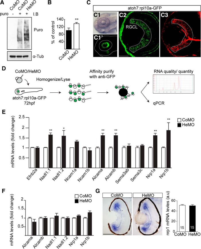 Figure 2. Hermes exerts a negative translational control of specific mRNAs in RGCs. Increase in puromycin incorporation detected by Western blotting in the Hermes-depleted condition compared with control (A, B). GFP expression is restricted to the eye in the atoh7:rpl10a-GFP transgenic line (C1, C1â²), with a positive signal in Zn-5 positive RGCs and photoreceptors (C2, C3). atoh7:rpl10a-GFP embryos at 72 hpf, injected with CoMO or HeMO, were homogenized and immunoprecipitations against GFP were performed on lysates. The total RNA was then extracted from the ribosomeâmRNA complexes, analyzed by bioanalyzer, and quantified by quantitative RT-PCR (D). Quantifications show an increase of nadl1.1, nadl1.2, alcama, alcamb, nrp1a, and nrp1b mRNAs bound to ribosomes in absence of Hermes (E). Quantifications of total RNAs input show no difference between CoMO and HeMO conditions (F). nrp1 in situ hybridization on 72 hpf retinal transverse sections shows no difference between HeMO- and CoMO-injected embryos (G). Quantifications of signal intensity show no difference in nrp1 expression in HeMO compared with CoMO (G). mRNA levels were calculated by using the formula 2âδδCt with β-actin mRNA as a calibrator (E, F). Error bars indicate SEM. Numbers of embryos analyzed are indicated on bars. Scale bars: C2, C3, 30 μm; G, 100 μm.