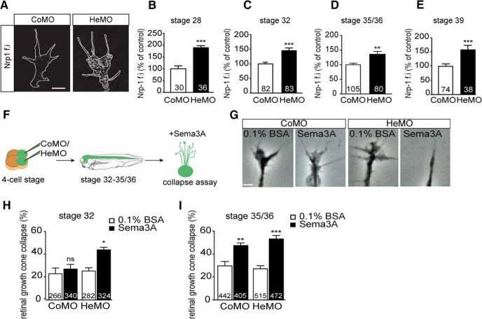 Figure 3. Hermes depletion increases Nrp1 protein in axons and induces an earlier response to Sema3A. Immunostainings on stage 32 Xenopus retinal explants show increased Nrp1 expression on Hermes-depleted growth cone compared with control (A). Quantifications show a significant increase in Nrp1 signal intensity in the growth cone at stage 28 (B), stage 32 (C), stage 35/36 (D), and stage 39 (E) embryos. Eye explants were cultured from stage 32 and 35/36 Xenopus embryos for 24 h. Sema3A was added for 10 min before fixation and the percentage of collapsed growth cones was determined (F). BSA was used as a control. Examples of collapse response of control and Hermes-depleted growth cones (G). At stage 32, Hermes-depleted growth cones display a significantly higher collapse response to Sema3A compared with control (H). This increase in collapse response is not present at stage 35/36 (I). Error bars indicate SEM. Numbers of growth cones analyzed are indicated on bars. Scale bars, 100 μm.