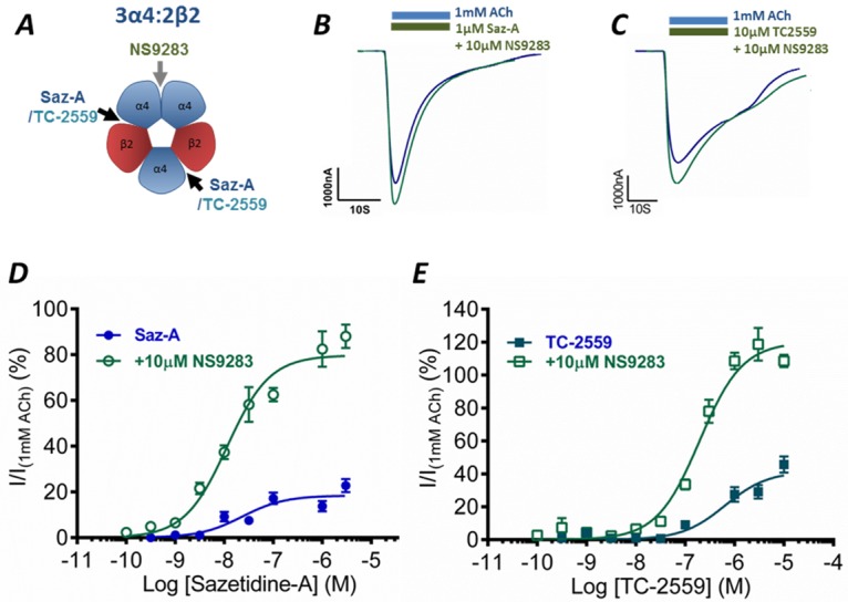 The α4β2 nicotinic acetylcholine receptor (nAChR) is the most abundant subtype in the brain and exists in two functional stoichiometries: (α4)3(β2)2 and (α4)2(β2)3. A distinct feature of the (α4)3(β2)2 receptor is the biphasic activation response to the endogenous agonist acetylcholine, where it is activated with high potency and low efficacy when two α4-β2 binding sites are occupied and with low potency/high efficacy when a third α4-α4 binding site is occupied. Further, exogenous ligands can bind to the third α4-α4 binding site and potentiate the activation of the receptor by ACh that is bound at the two α4-β2 sites. We propose that perturbations of the recently described pre-activation step when a third binding site is occupied are a key driver of these distinct activation properties. To investigate this, we used a combination of simple linear kinetic models and voltage clamp electrophysiology to determine whether transitions into the pre-activated state were increased when three binding sites were occupied. We separated the binding at the two different sites with ligands selective for the α4-β2 site (Sazetidine-A and TC-2559) and the α4-α4 site (NS9283) and identified that when a third binding site was occupied, changes in the concentration-response curves were best explained by an increase in transitions into a pre-activated state. We propose that perturbations of transitions into a pre-activated state are essential to explain the activation properties of the (α4)3(β2)2 receptor by acetylcholine and other ligands. Considering the widespread clinical use of benzodiazepines, this discovery of a conserved mechanism that benzodiazepines and ACh potentiate receptor activation via a third binding site can be exploited to develop therapeutics with similar properties at other cys-loop receptors.