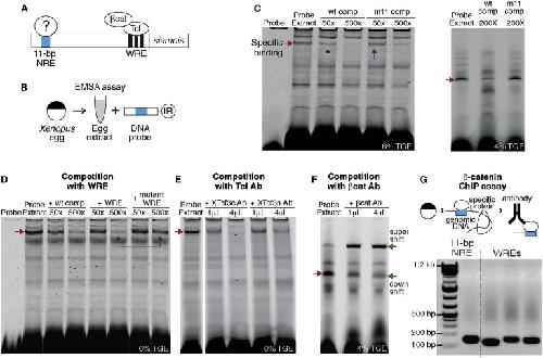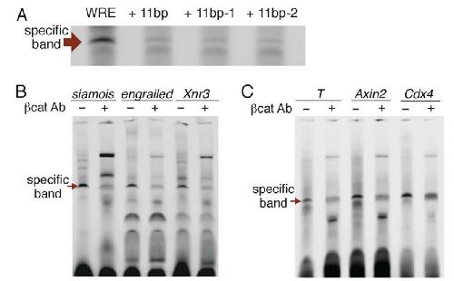 (A) The three 11-bp NREs in siamois promoter compete with WRE. WRE probe without competition (lane 1) and with 200x unlabeled 11-bp NRE (lane 2) and the 2 elements similar to the 11-bp NRE (lanes 3 and 4). (B-C) EMSA assays of predicted 11-bp NREs in promoters of siamois, engrailed, Xnr3 (B) T, Axin2, and Cdx4 (C). Red arrow: specific binding to the 11-bp NRE.