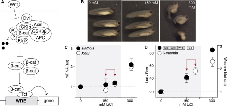 (D) Black circle, luciferase/renilla signal from the TopFlash reporter injected at the four-cell stage; white circle, β-catenin level in the embryo measured using western blot. Red arrows highlight how β-catenin level and TopFlash expression change with moderate perturbations.