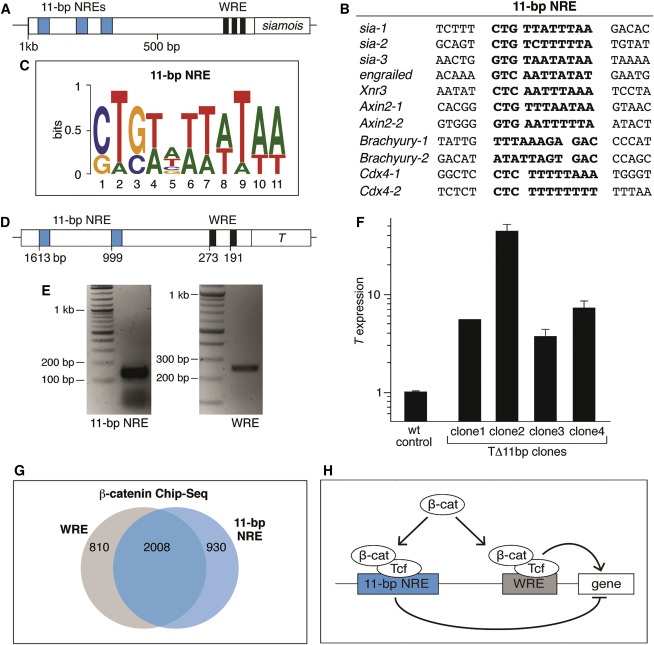 (E) ChIP using β-catenin antibody, followed by PCR amplification from 11-bp NRE (left) and WRE region (right) in the T promoter. The result was reproducible across two biological replicates. To ensure that immunoprecipitation of the 11-bp NRE fragments was not confounded by the WRE, we sonicated the chromatin to 100â300 bp and performed PCR validation.