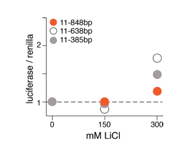 A 30-bp region containing the 11-bp NRE was added to the 5’-end of 848bp (orange), 638bp (white), and 385bp (grey) of siamois promoter. Xenopus embryos were injected with the constructs at 4-cell stage, treated with lithium for 5 minutes at 32- to 64-cell stage, and harvested at stage 10 for luciferase analysis.